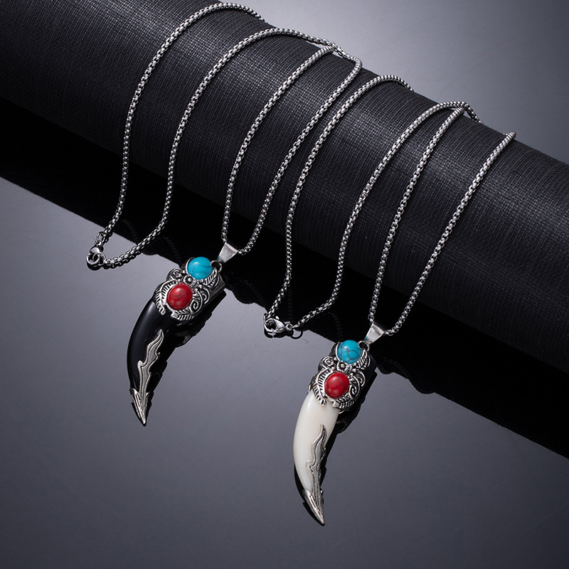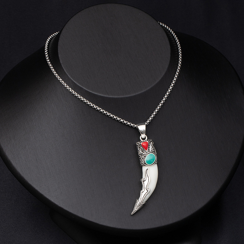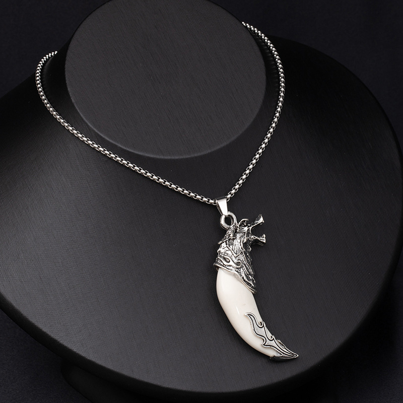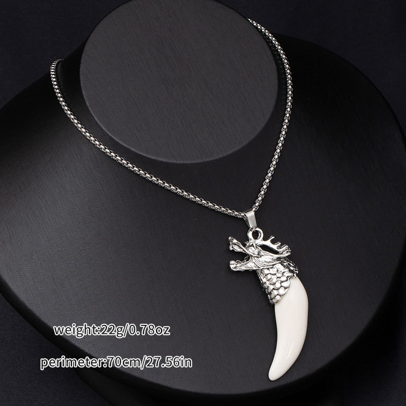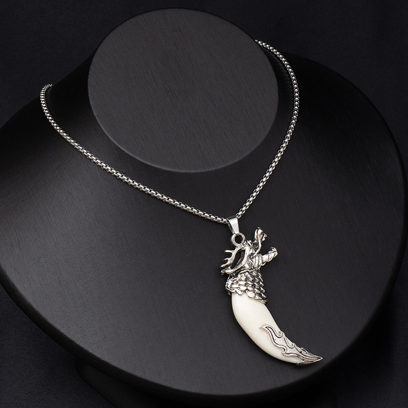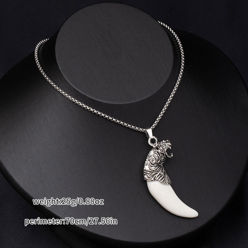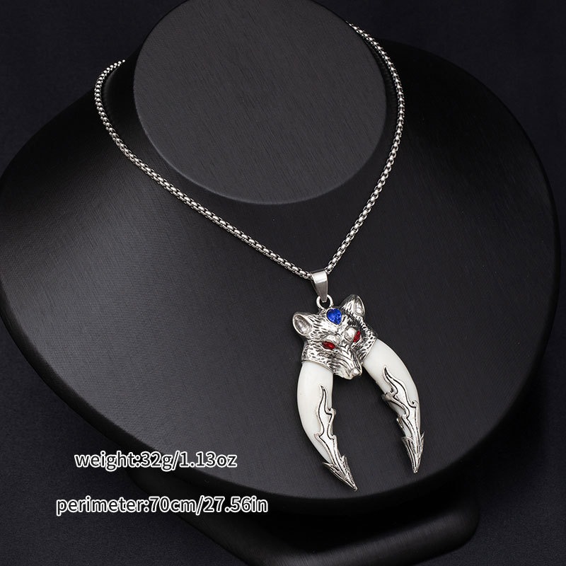 Retro ethnic style simulation wolf fang stainless steel necklace for men, bold and unique wolf and tiger head long-length accessories wholesale supply