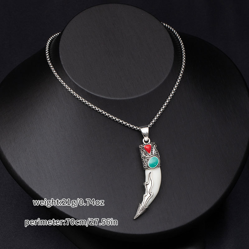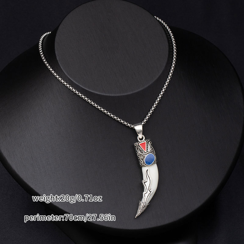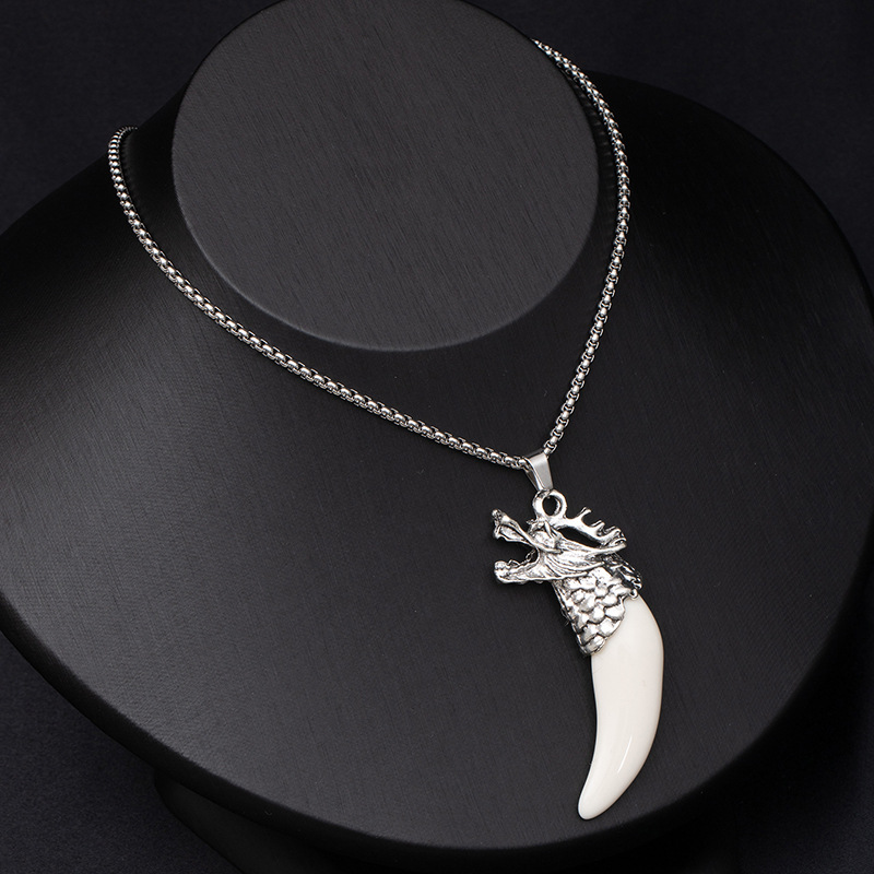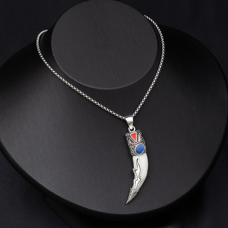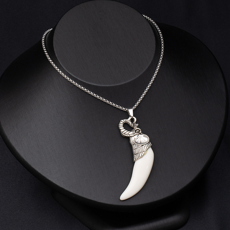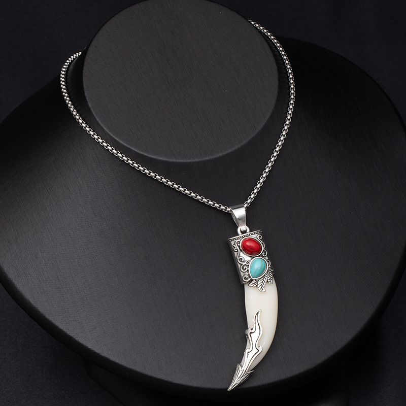 Retro ethnic style simulation wolf fang stainless steel necklace for men, bold and unique wolf and tiger head long-length accessories wholesale supply