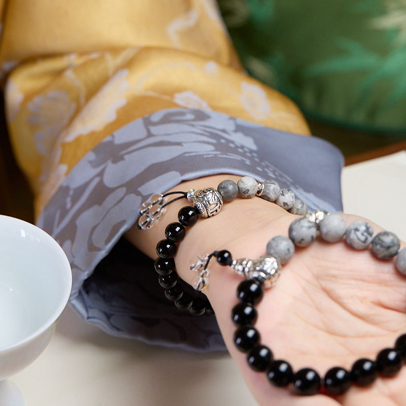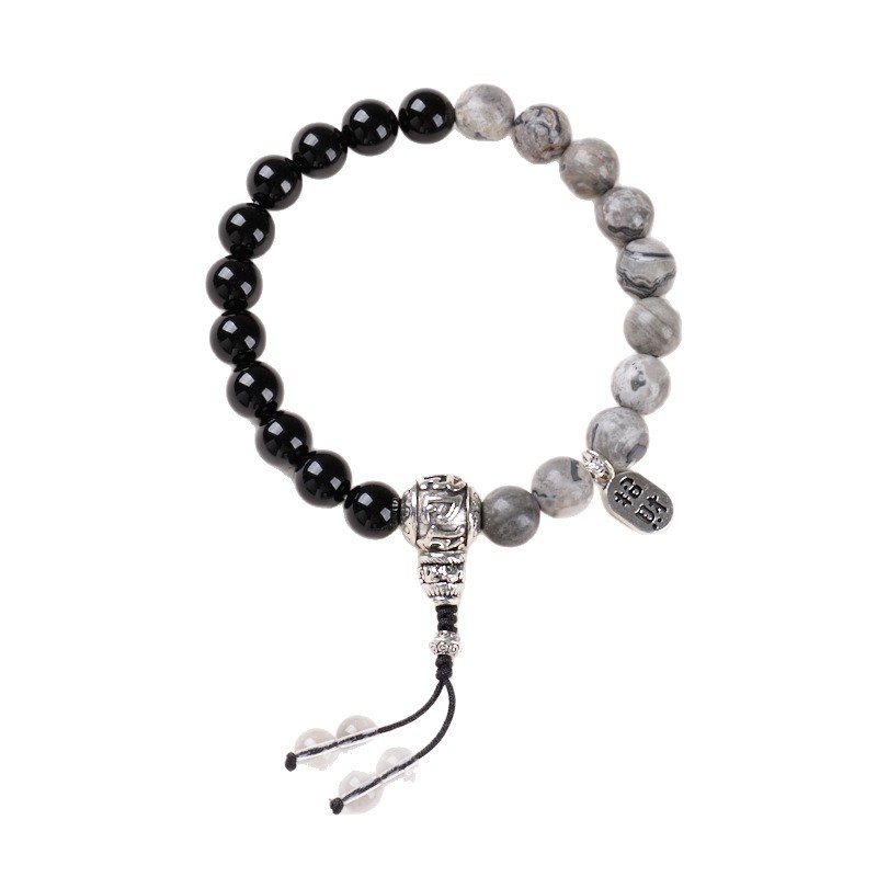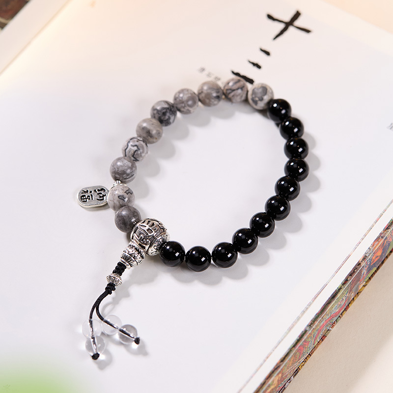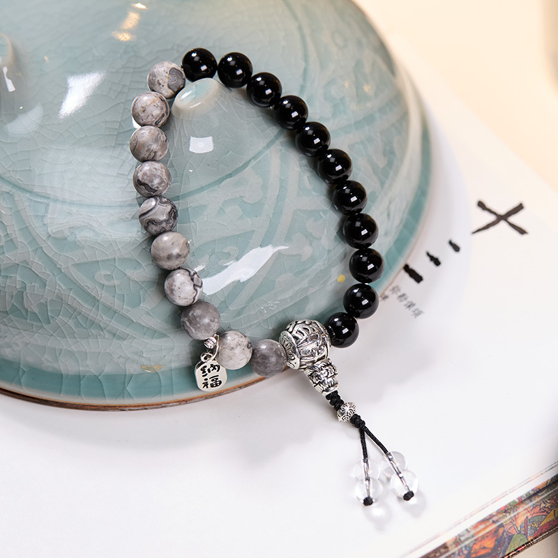 [women's] 8mm black agate map stone tibetan silver cai nafu bracelet