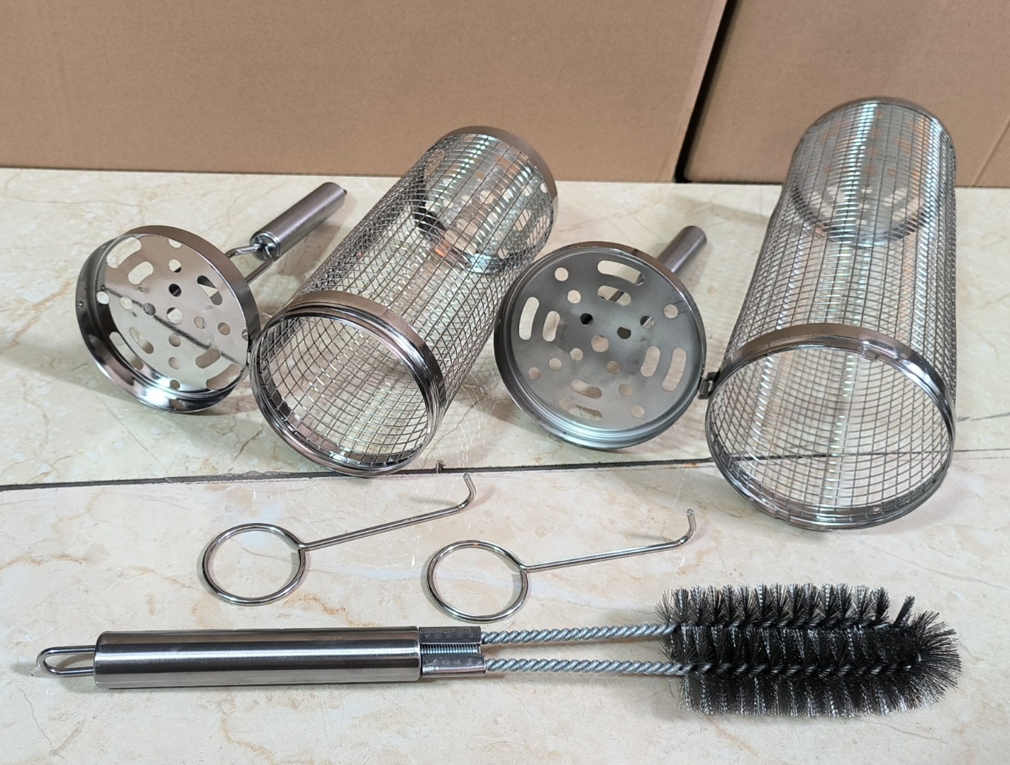 The packaging box is made of kraft paper B9 reinforced, and the cardboard is robust to protect the roasting cage.