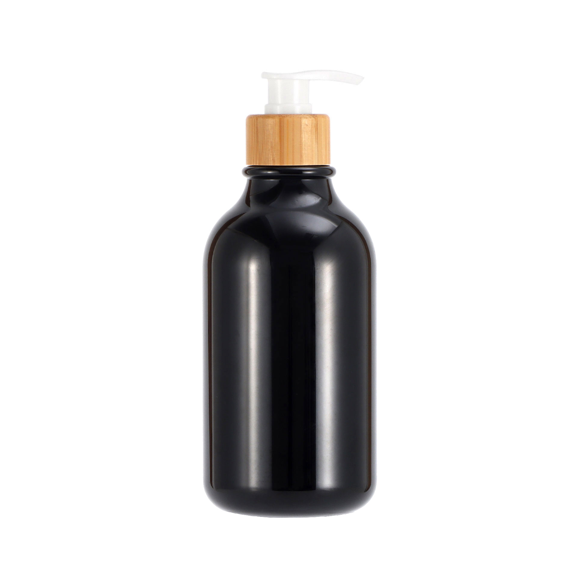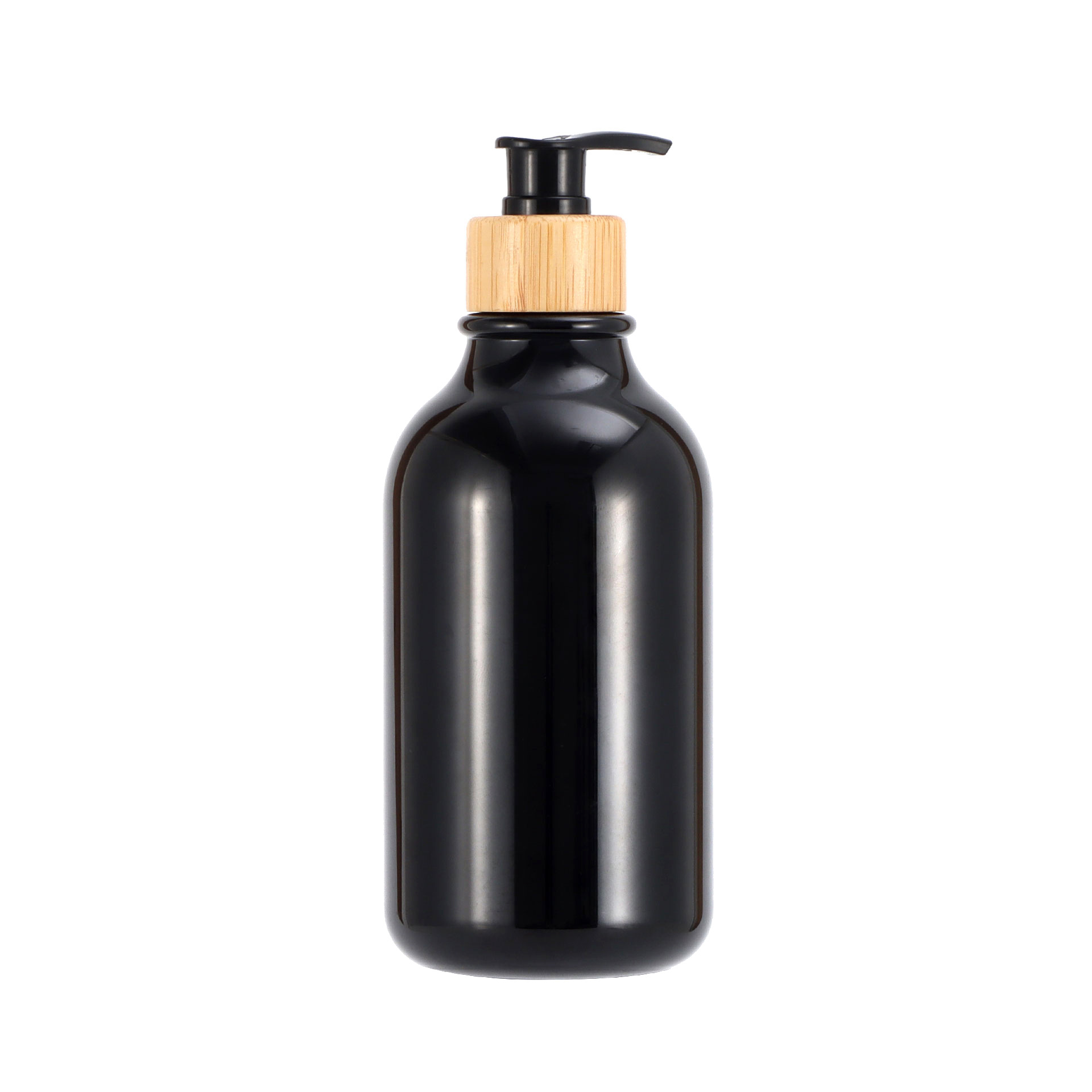 300ml; bright black bottle + black bamboo pump; pet