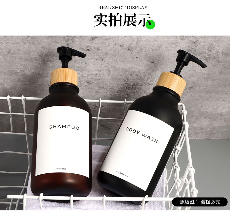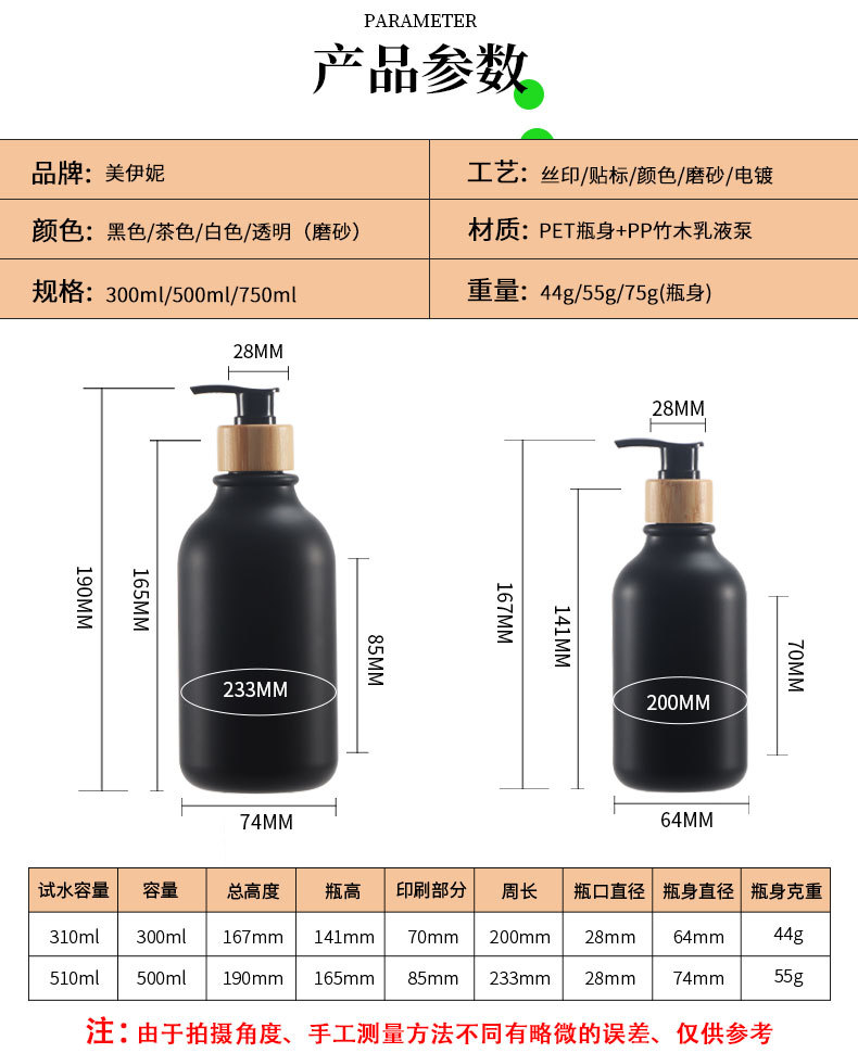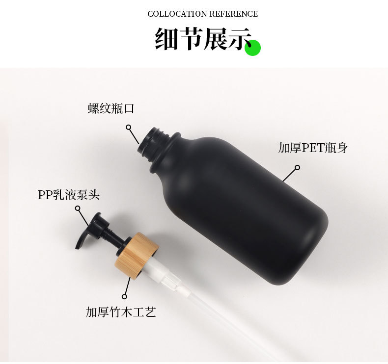 500ml; matte black bottle + white bamboo pump; pet