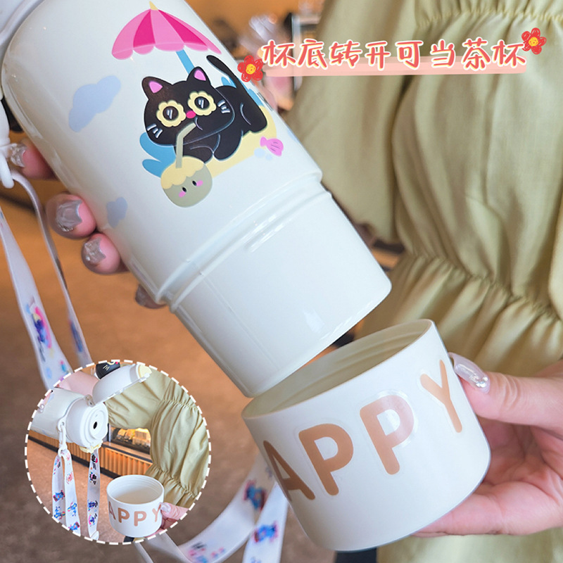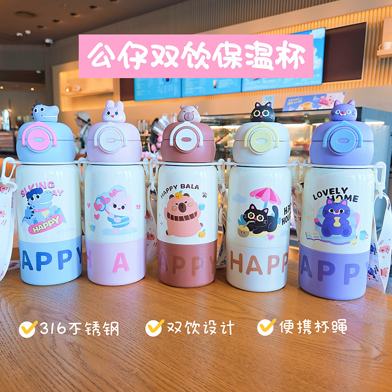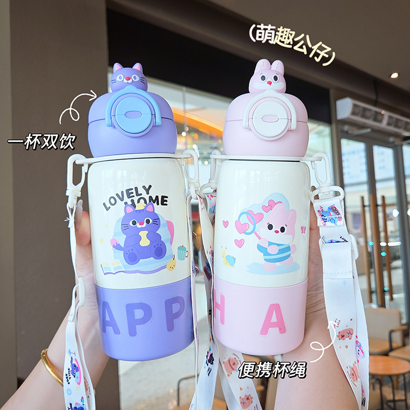 good-looking children's double drink cartoon thermal mug student portable large capacity strap stainless steel straw drinking cup
