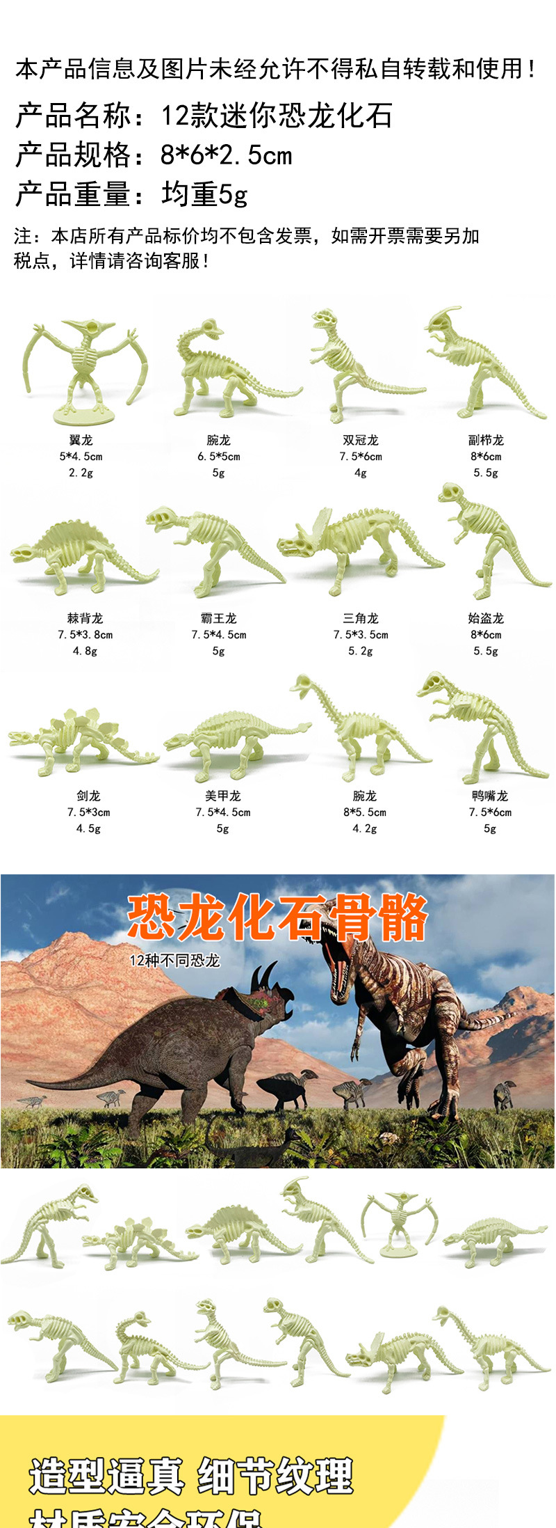 12 dinosaur fossils, mixed (8 * 6cm)5.5g