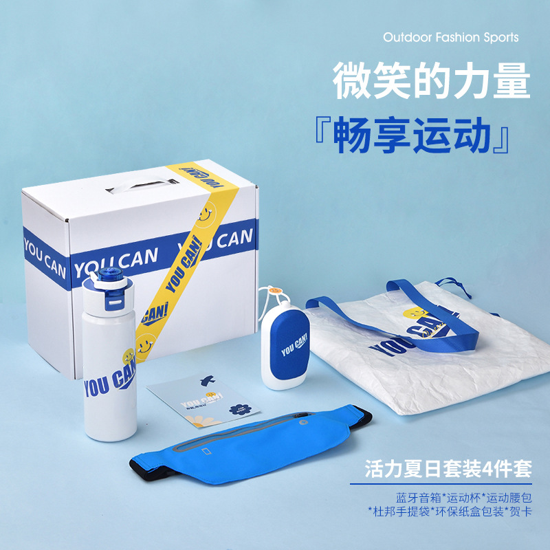 blue sports cup + bluetooth speaker + waist bag + handbag + gift box + greeting card