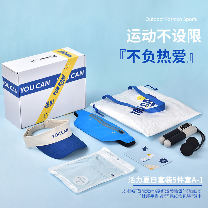sun hat + skipping rope + waist bag + mask + handbag + gift box + greeting card
