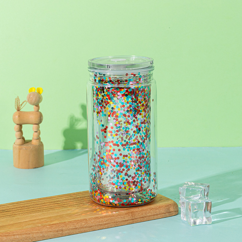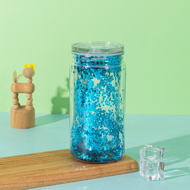 foreign trade new 16oz coke can plastic sippy cup double transparent sequins glitter cans water cup mason cup