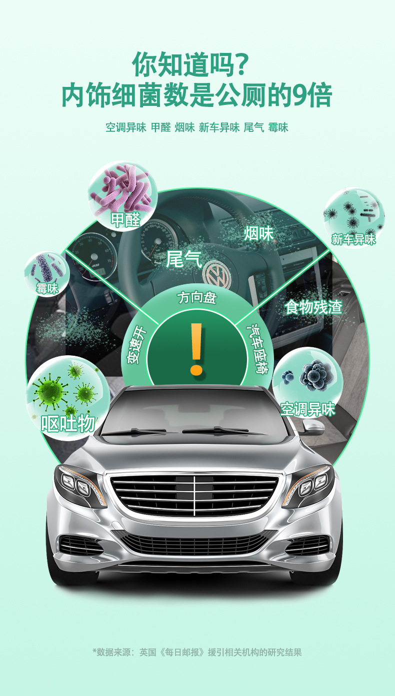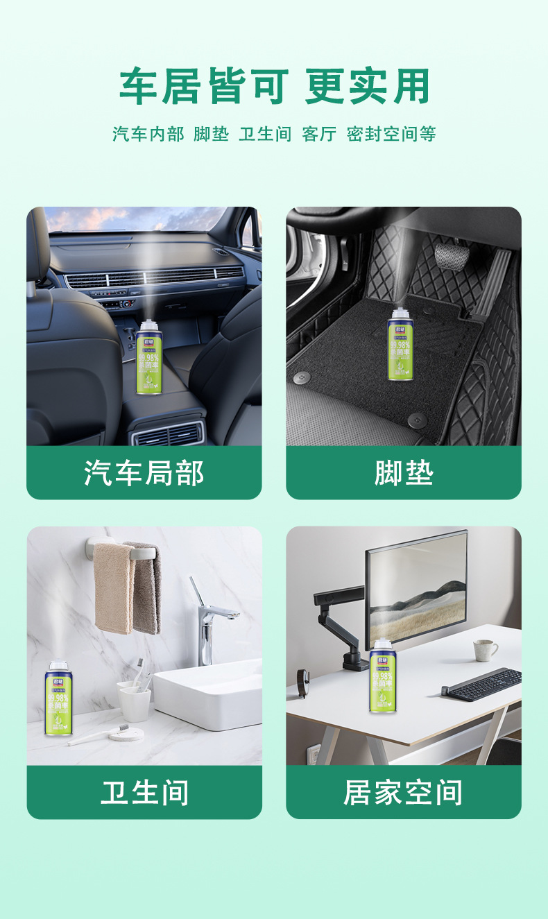 4. Shake the product well, open the cap, press the valve firmly, place it at the front foot area of the passenger seat (the inner ring air intake) or in the trunk, indoor, etc., a closed space that needs sterilization and deodorization, with the nozzle facing the air intake, quickly leave, and close the car door.