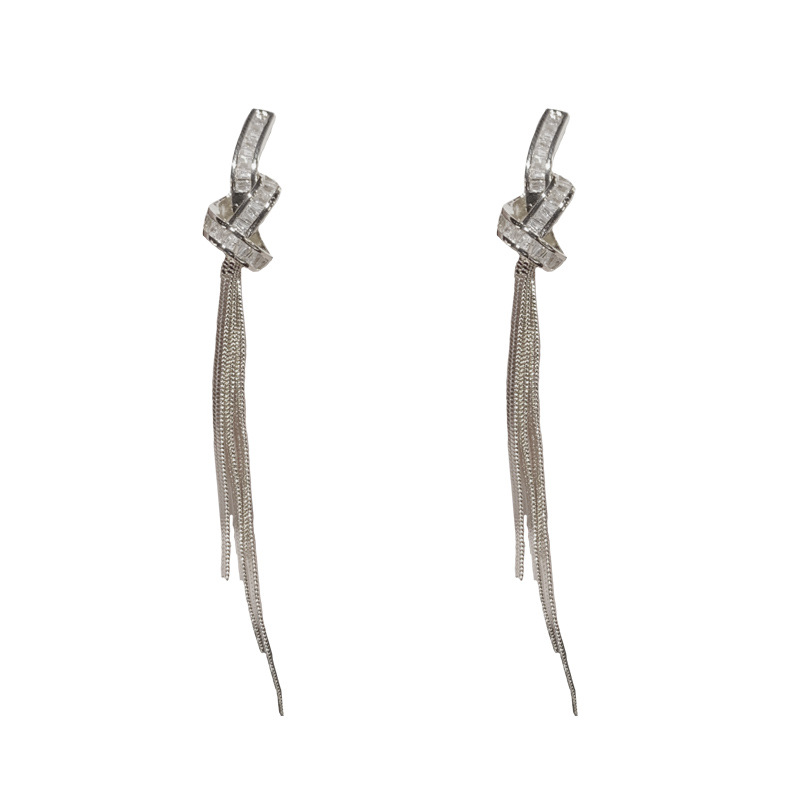 silver-zircon knotted long fringe earrings (thick real gold color retention)