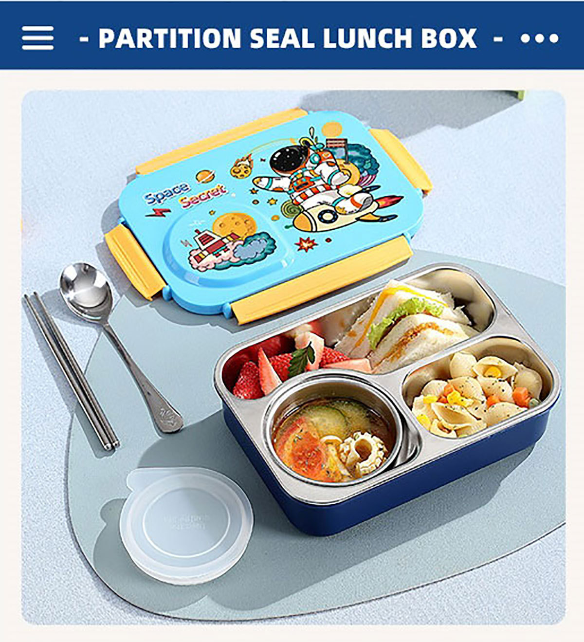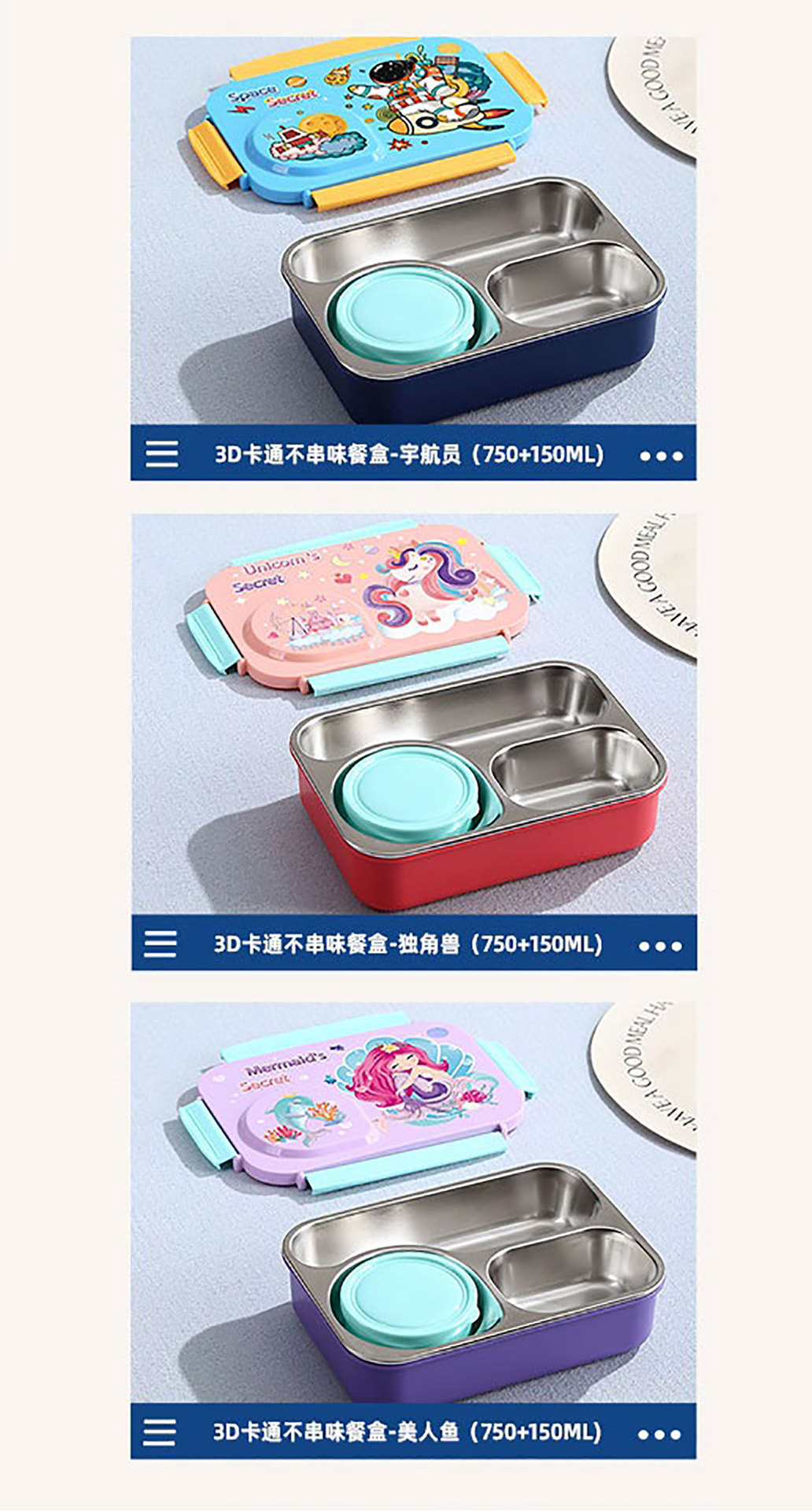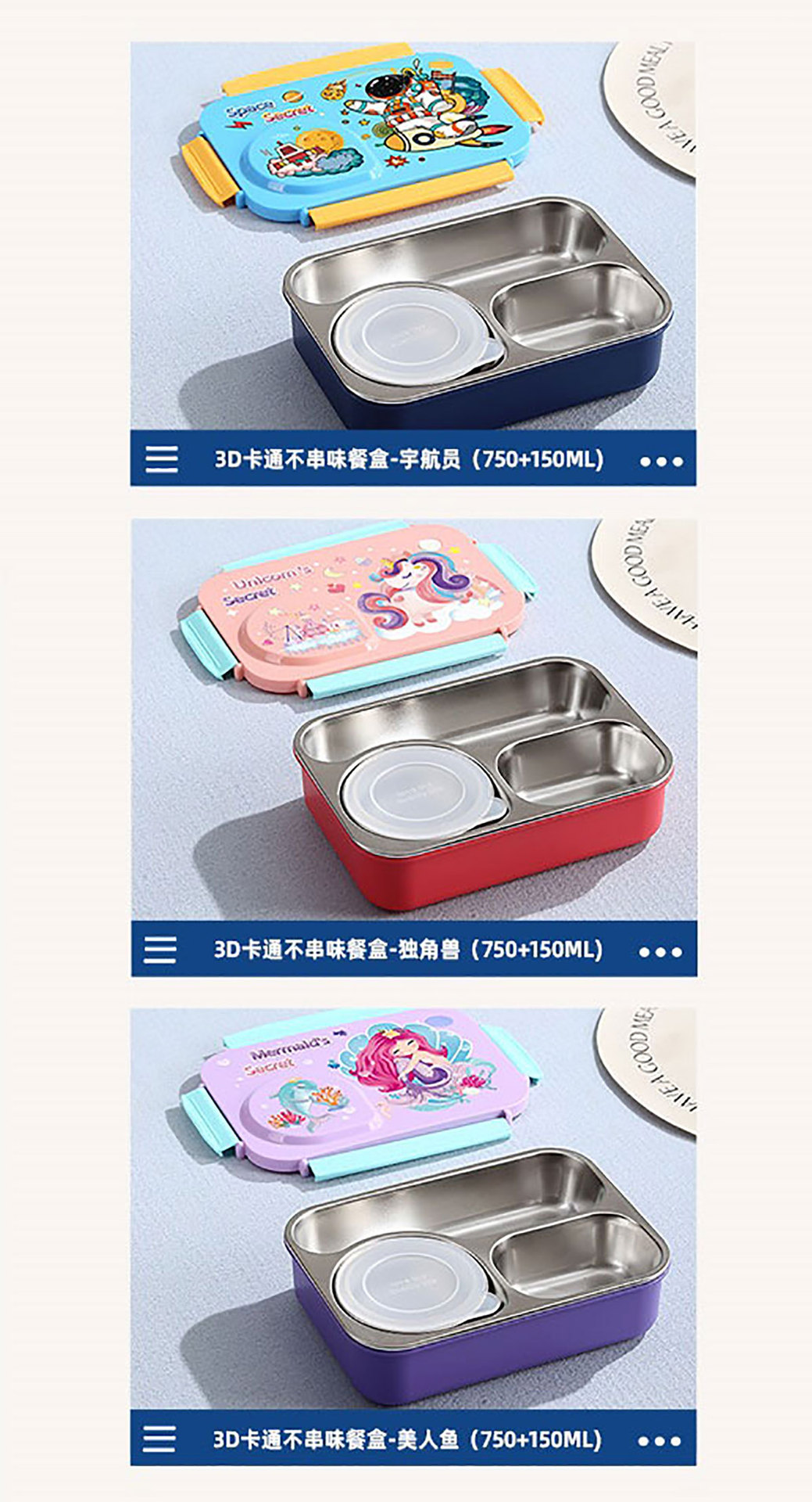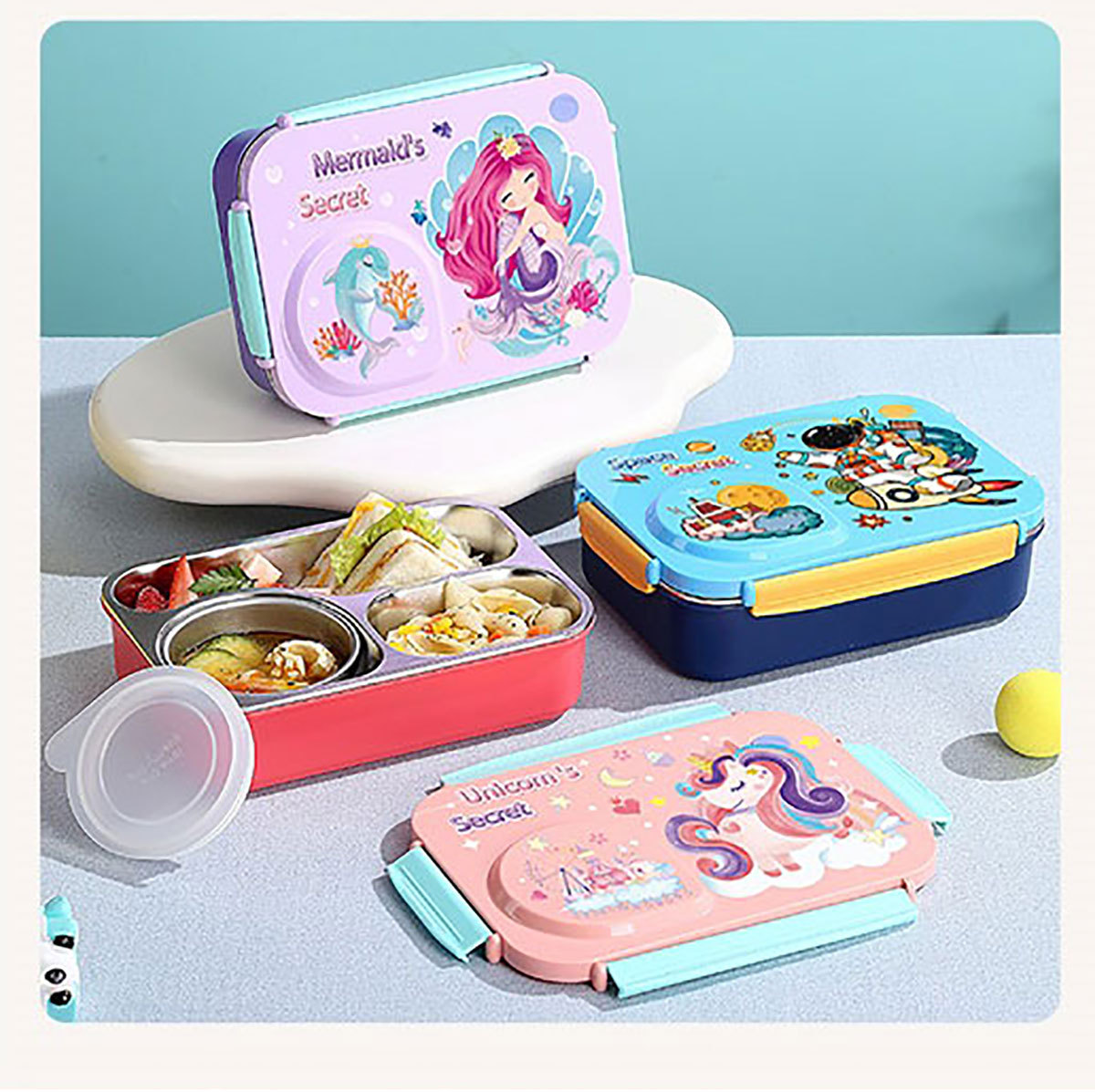 Product Name: Yajiali 3D Cartoon Non-Sticky Lunch Box (3-Compartment Stainless Steel 750ml + Plastic Bowl 150ml + Stainless Steel Utensils)