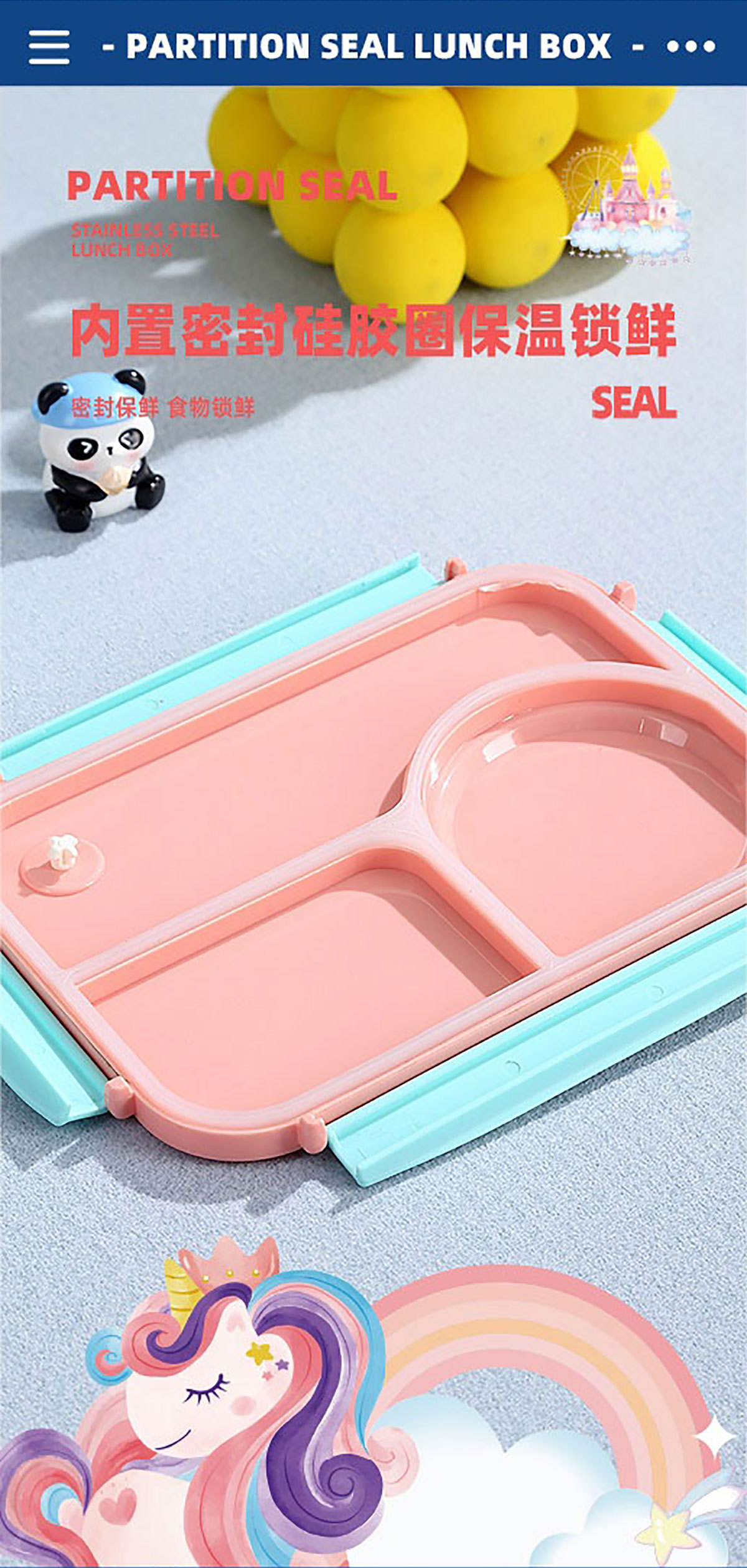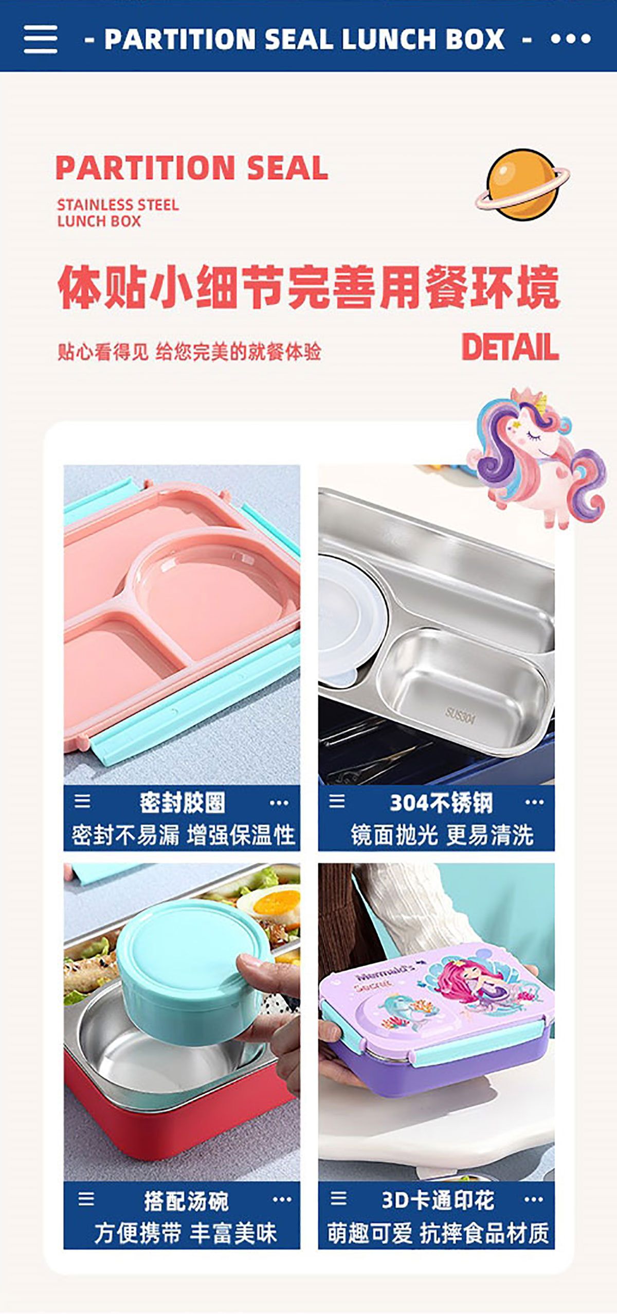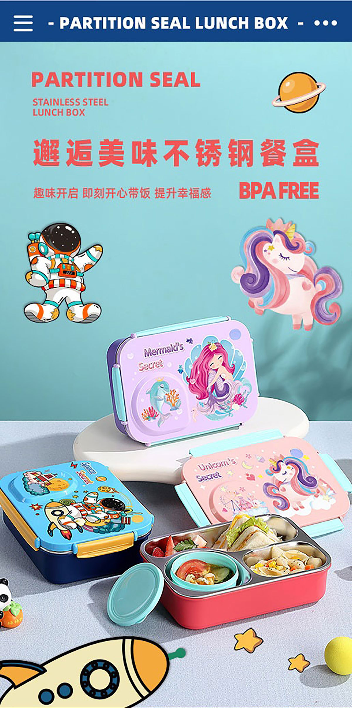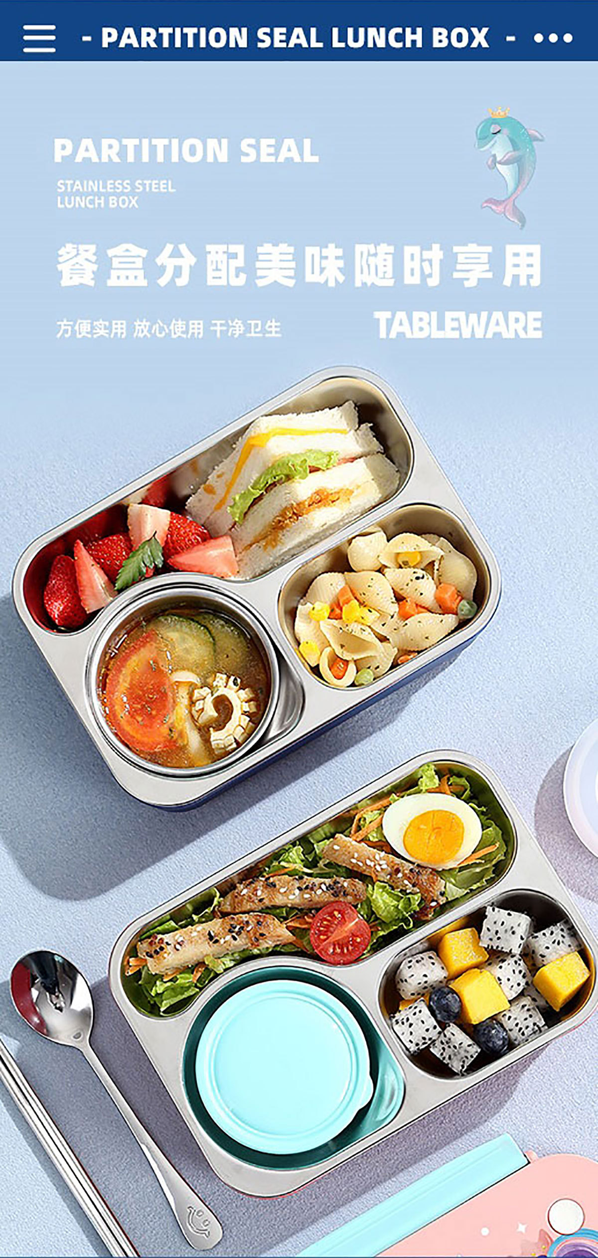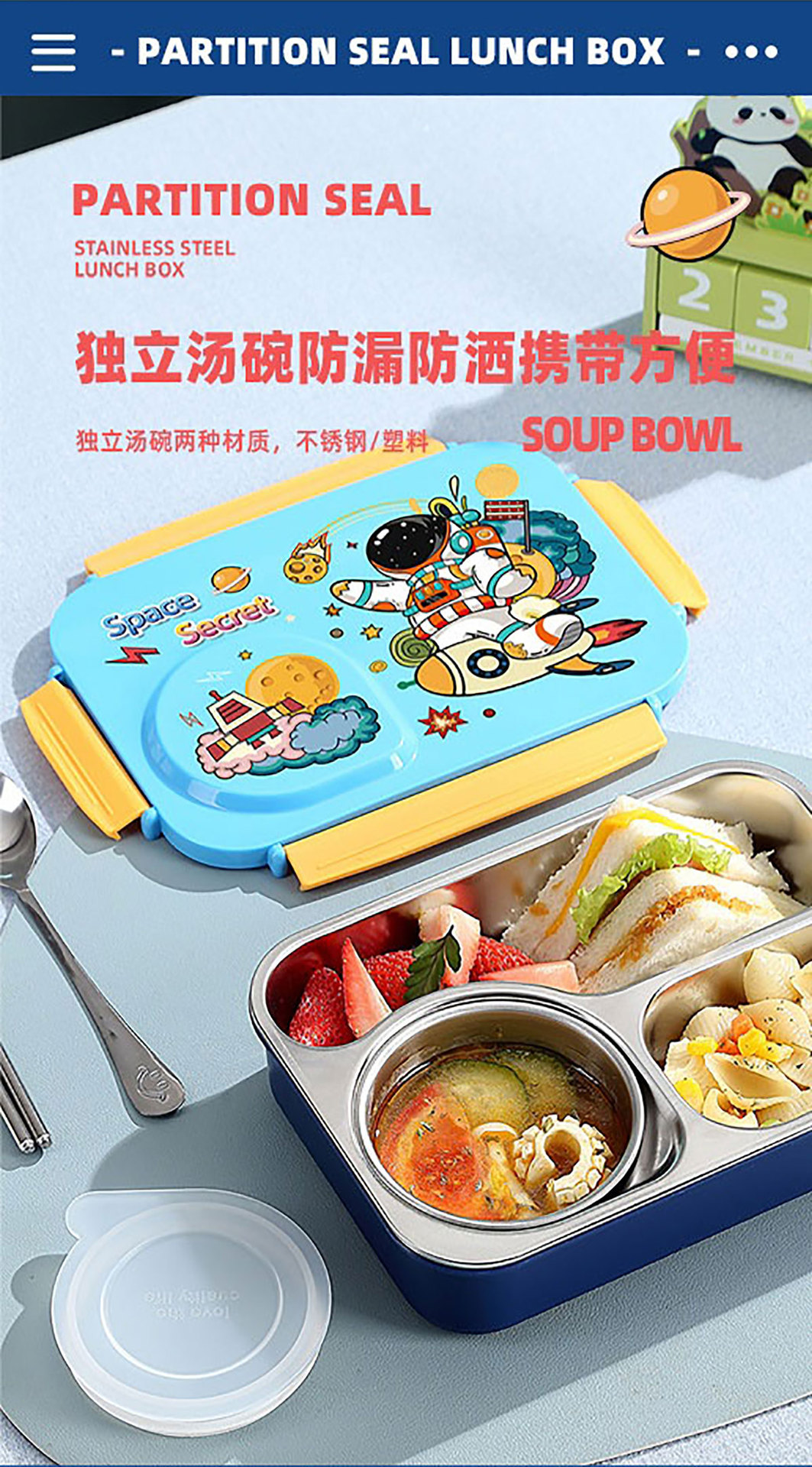 Product Name: Yajiali 3D Cartoon Non-Sticky Lunch Box (3-Compartment Stainless Steel 750ml + Plastic Bowl 150ml + Stainless Steel Utensils)