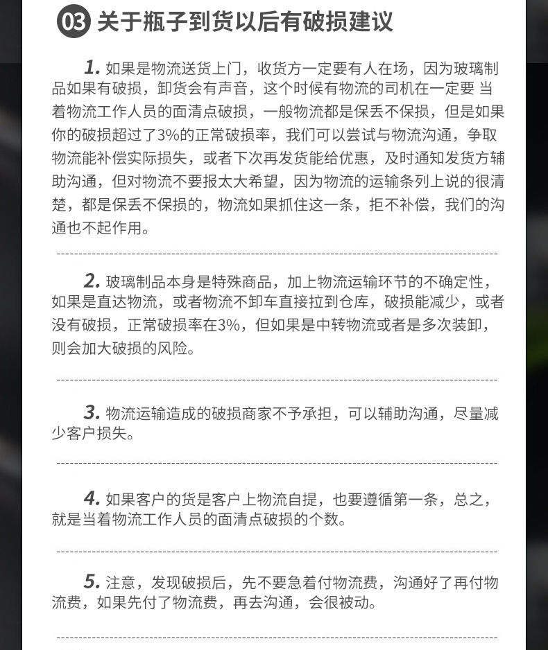 Due to the special nature of glass products, any damage caused by logistics during transportation is not covered by the seller.