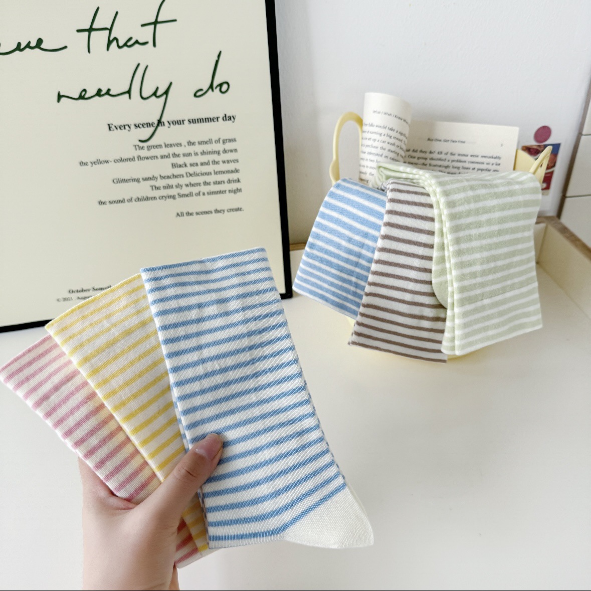 blue socks with white stripes