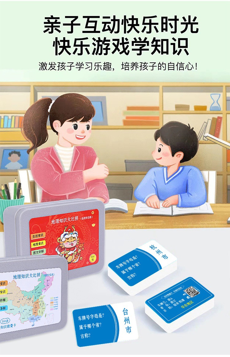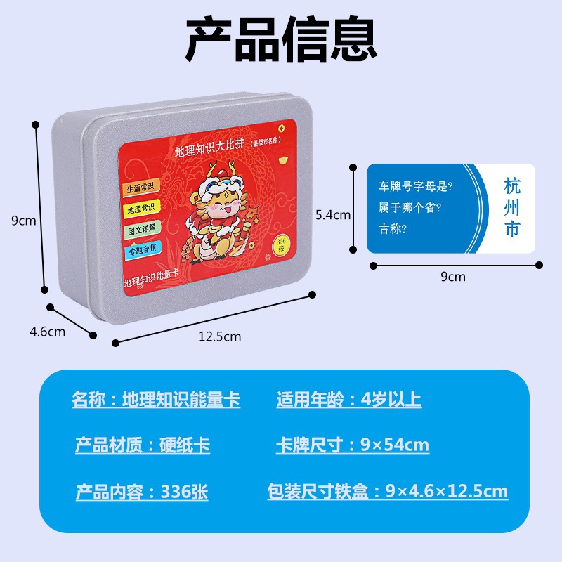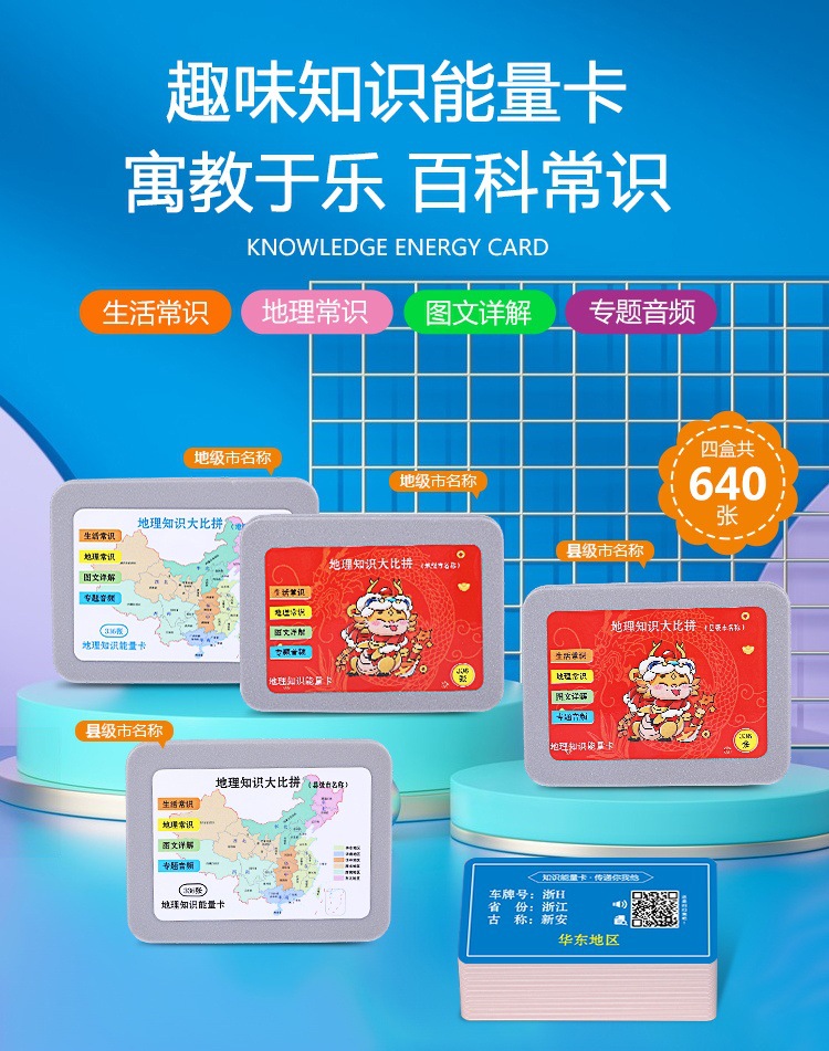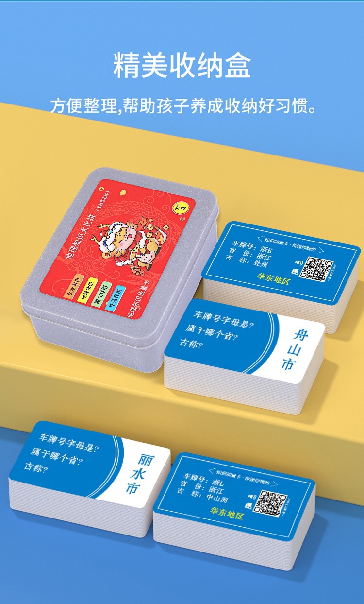 This geographical knowledge energy card is a carefully designed tool for geographical knowledge learning, including the names, locations, and historical developments of all the prefecture-level cities and directly-administered municipalities across the country. This product aims to help children better understand the geographical knowledge of various parts of the motherland, improve their comprehensive quality and cognitive ability.