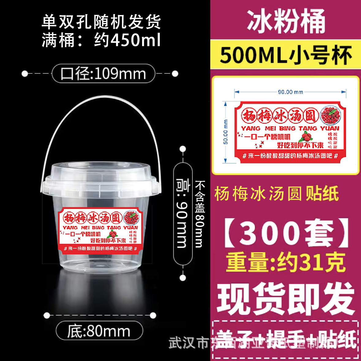 500ml hand bucket + cover + handle + waxberry ice soup round stickers-300 sets