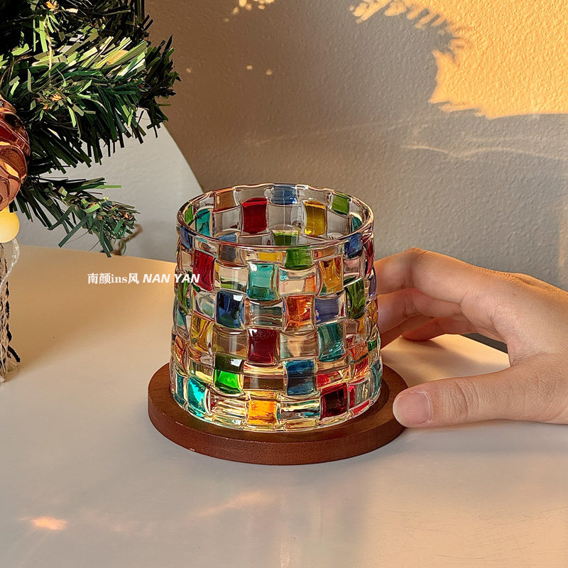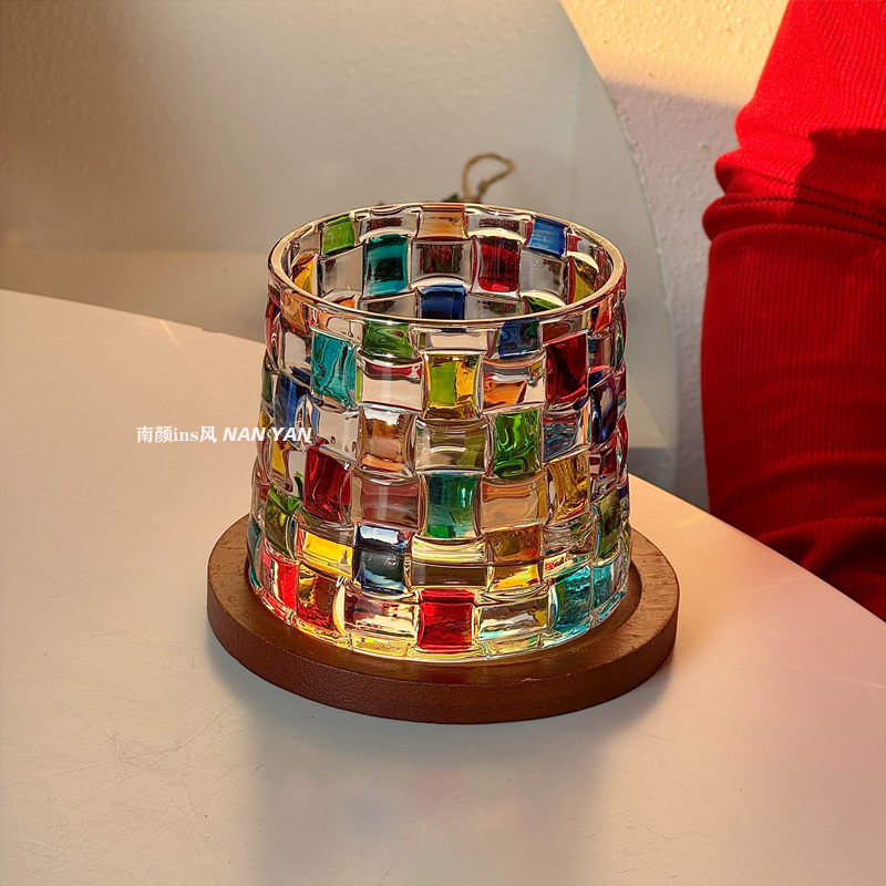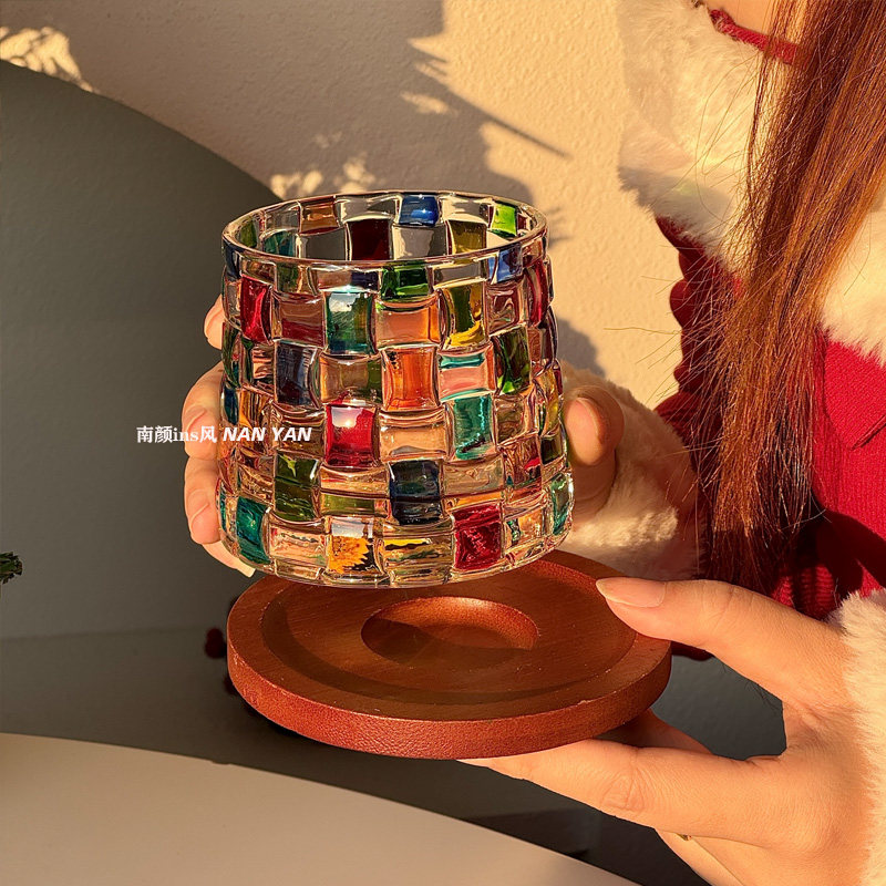 painted woven cup [with wooden base] set