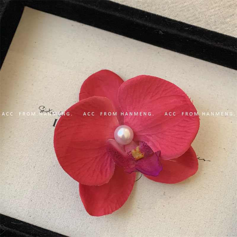 bright red-phalaenopsis pearl barrettes (raw silk)