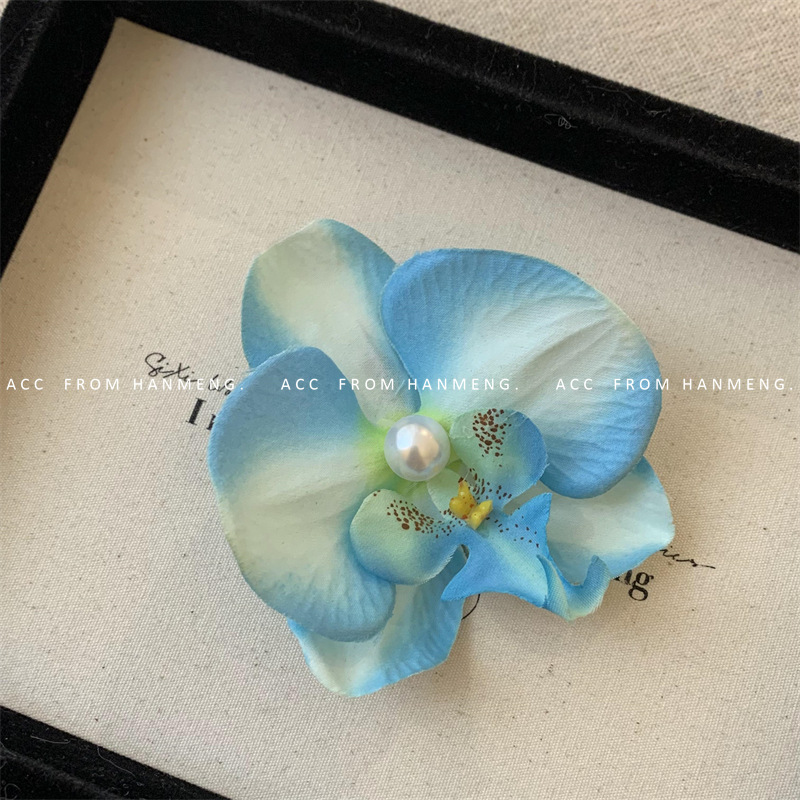 blue and white-phalaenopsis pearl barrettes (raw silk)