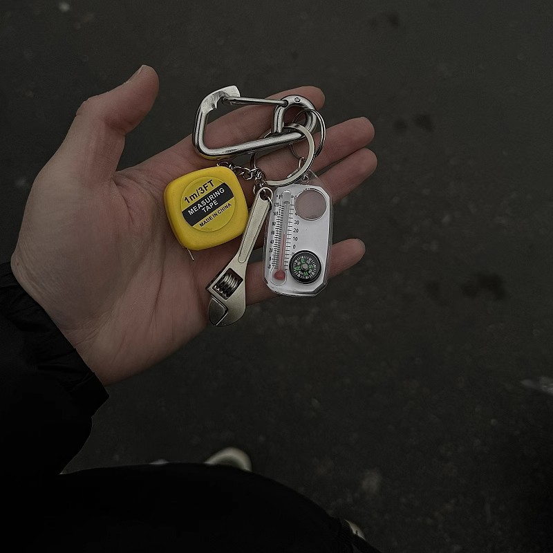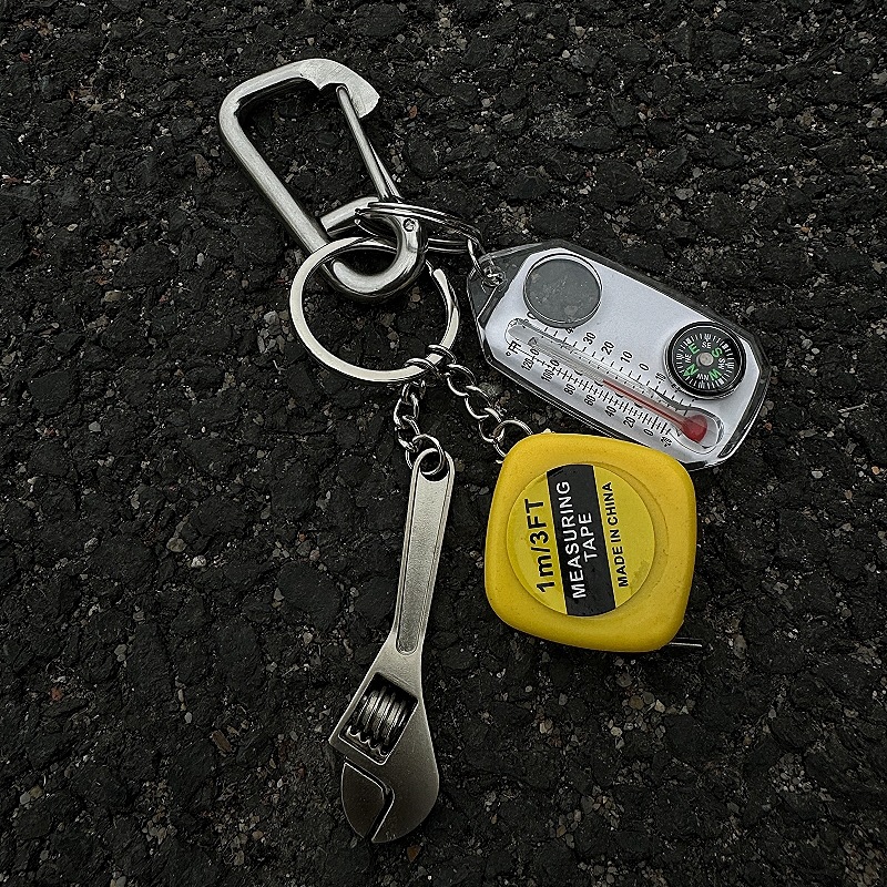 carabiner + mini tape measure + compass + wrench