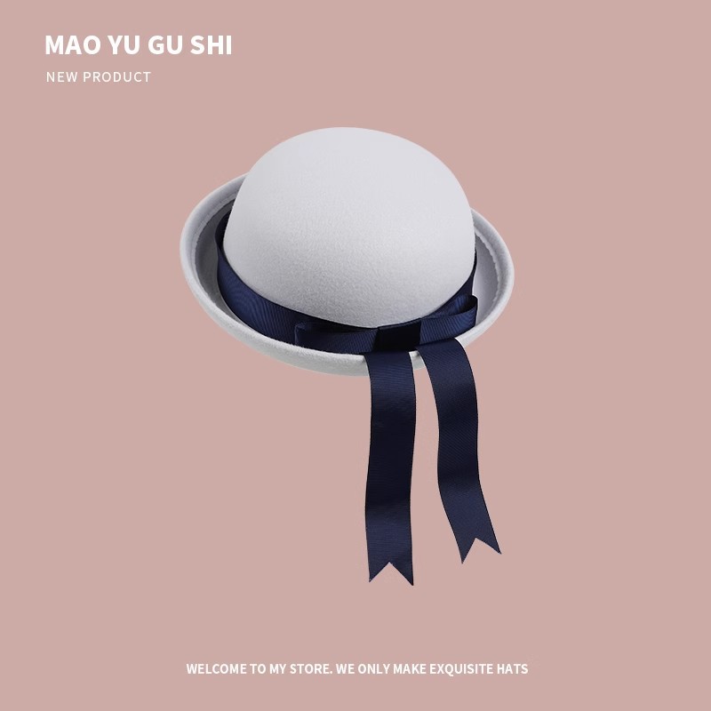 [round cap] white + navy blue ribbon bow
