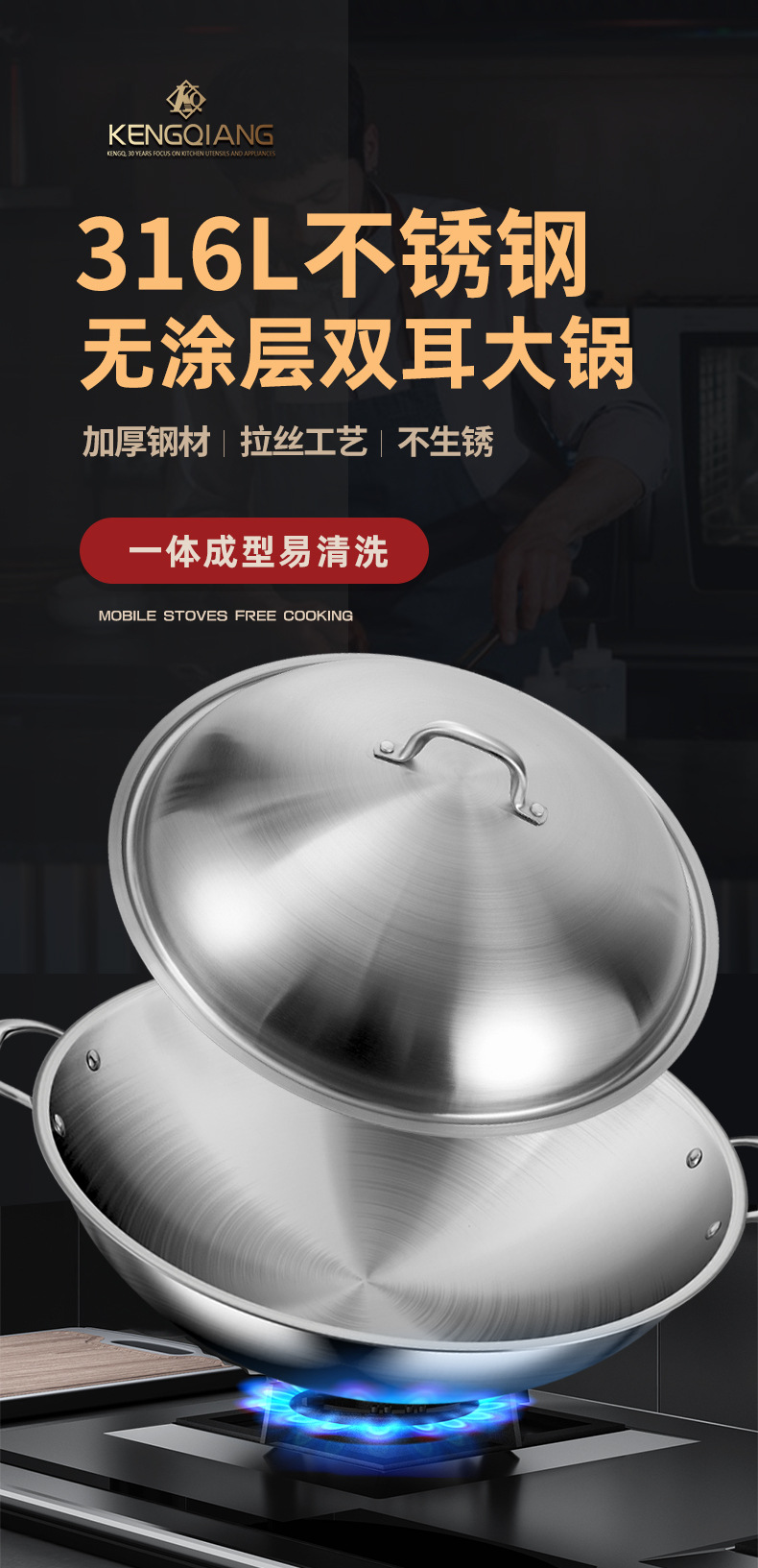 34cm flat bottom wok + steamer [316 steel refused chemical coating]]