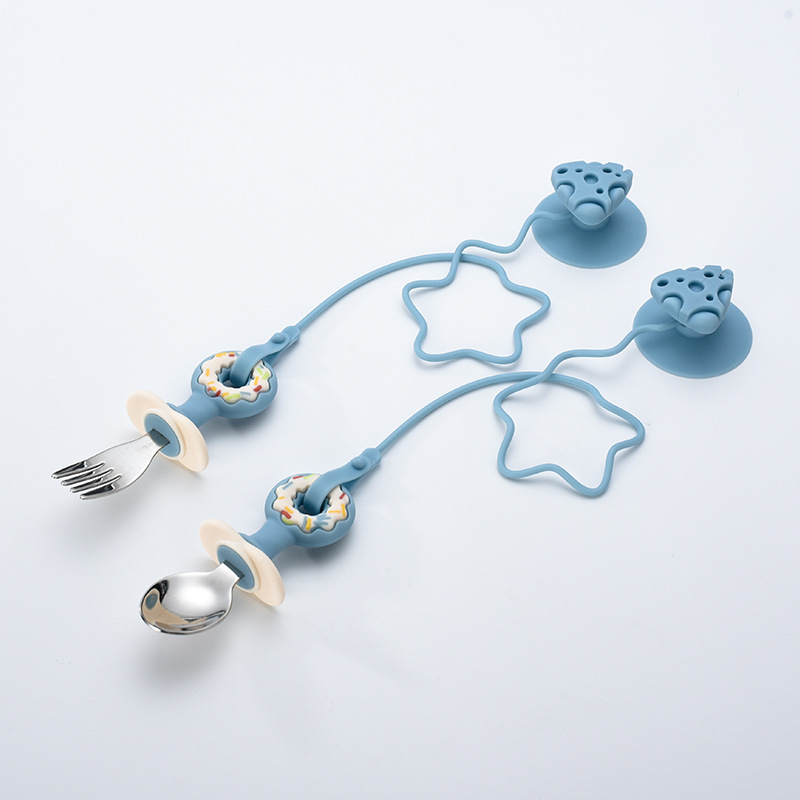 blue spoon fork with suction cup drop-preventing chain