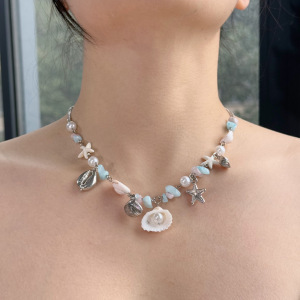 pearl shell blue beaded necklace