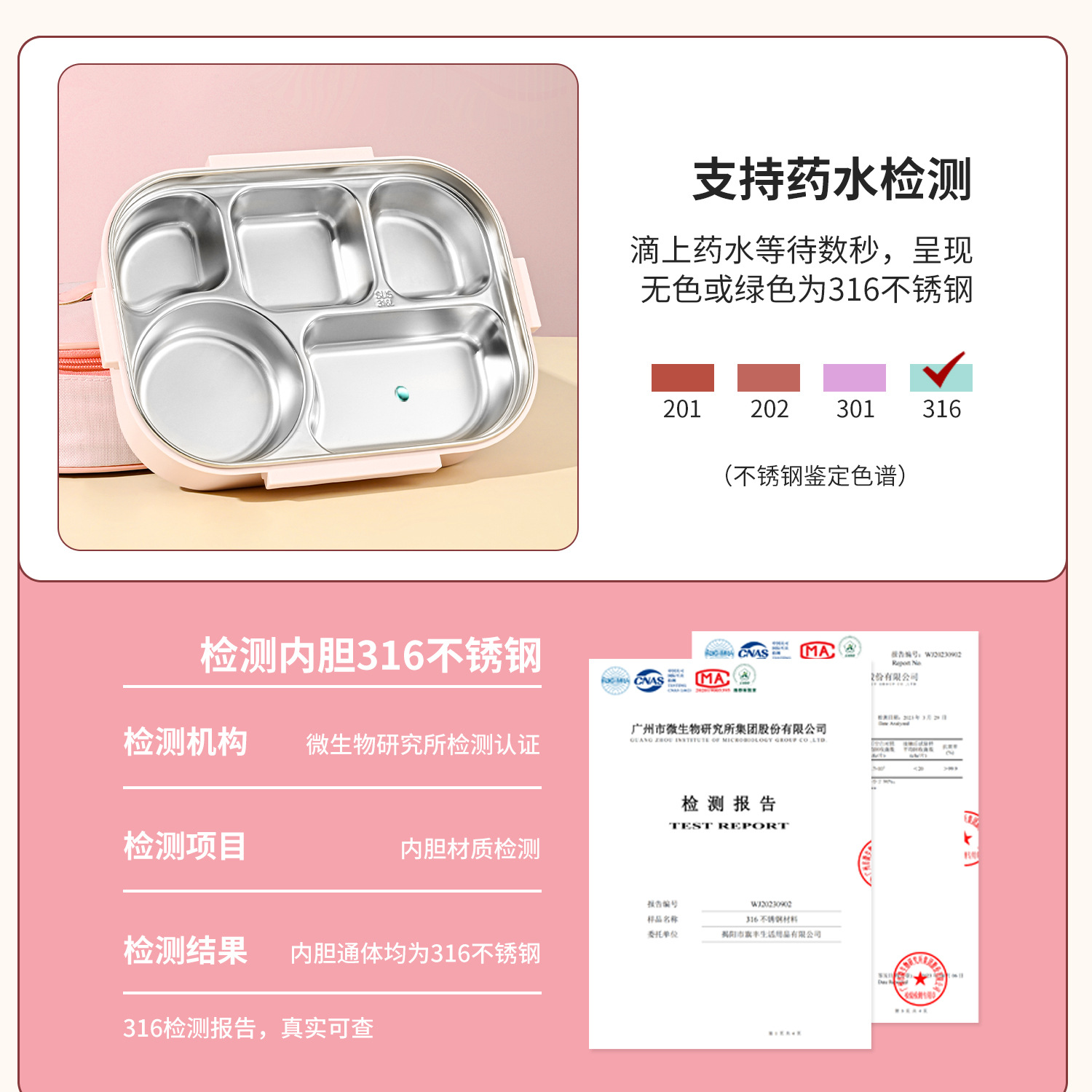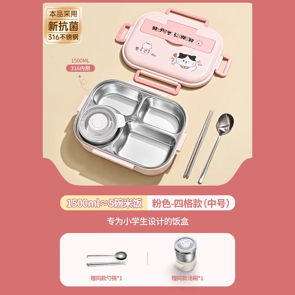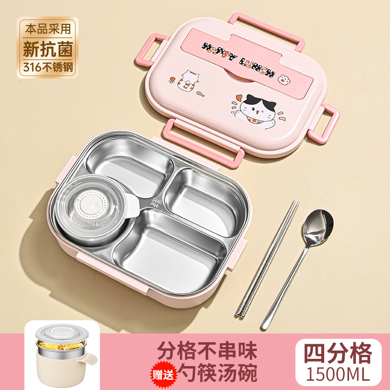 [upgrade thickened antibacterial 316l steel] pink four-grid 1500ml (send chopstick and spoon + soup bowl).