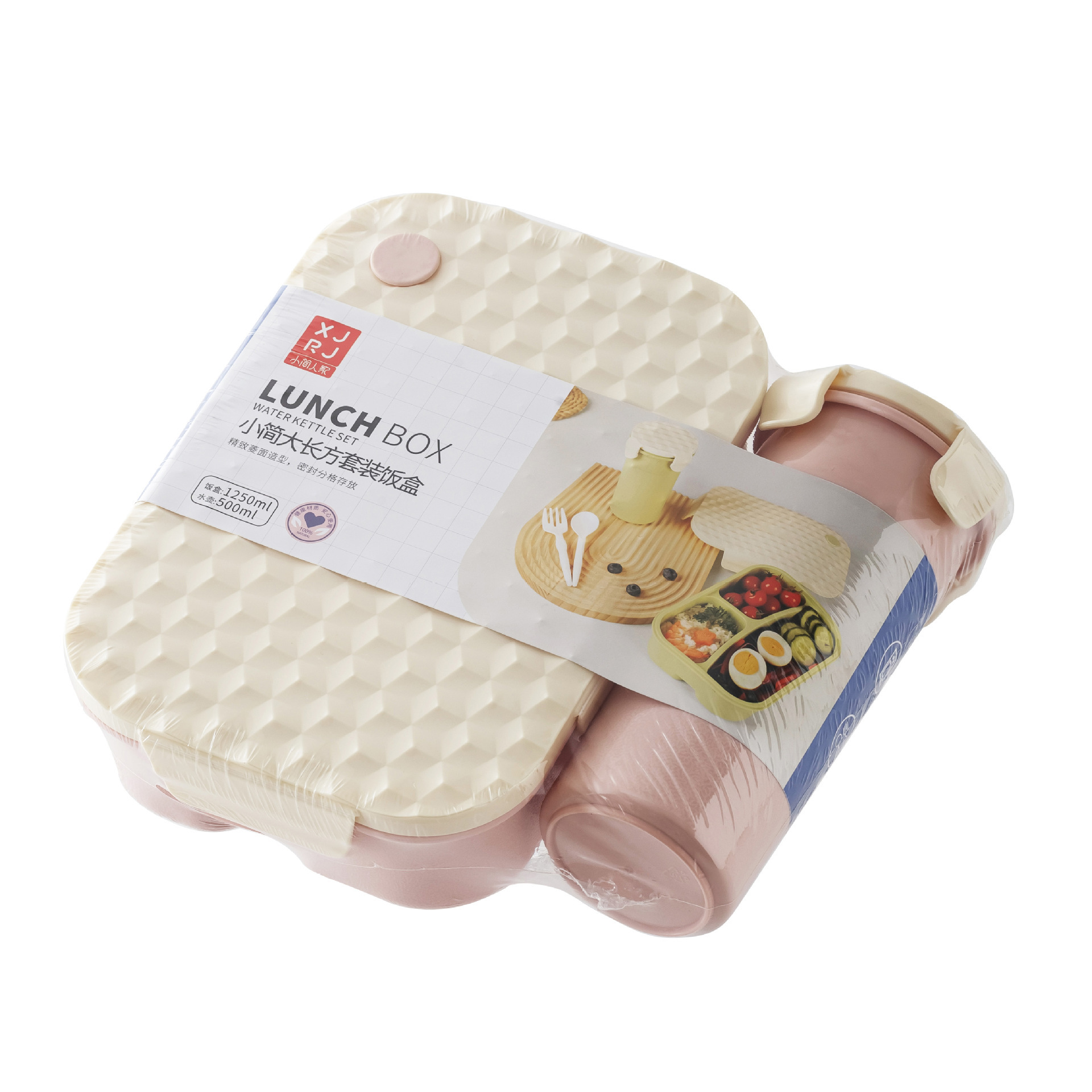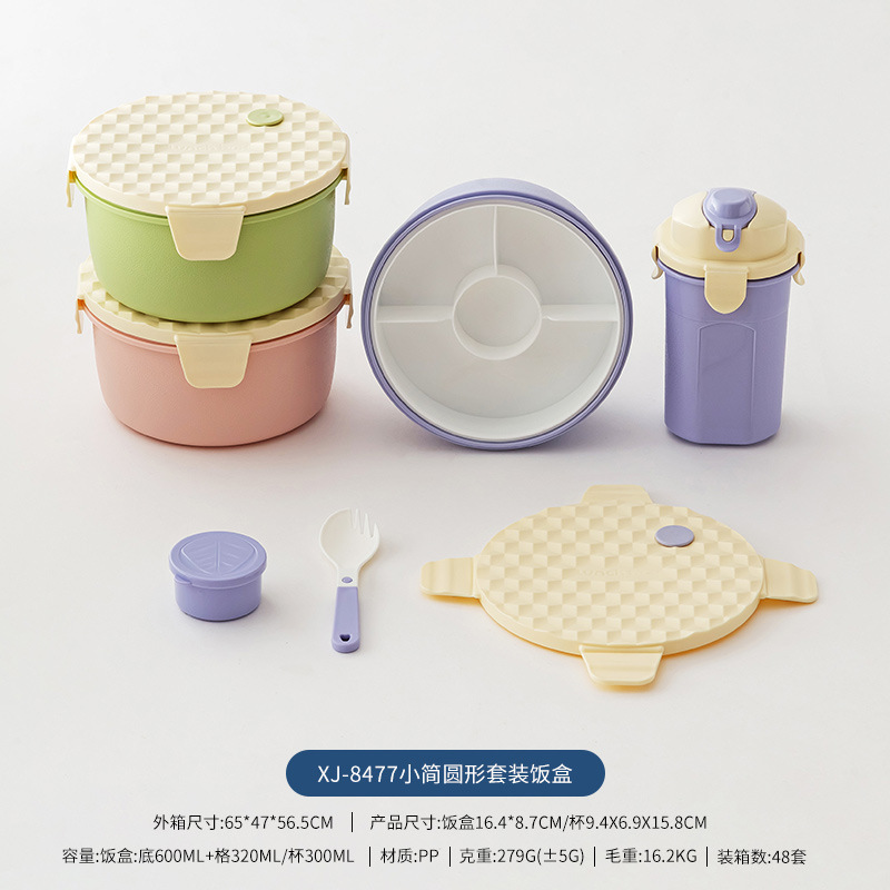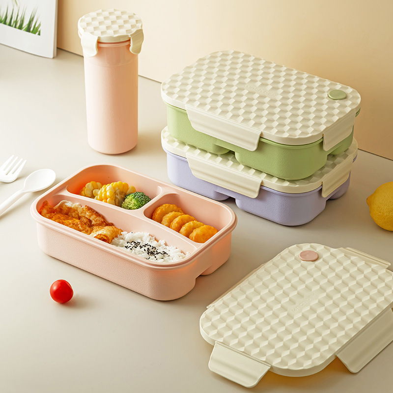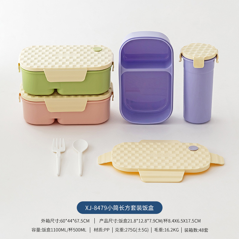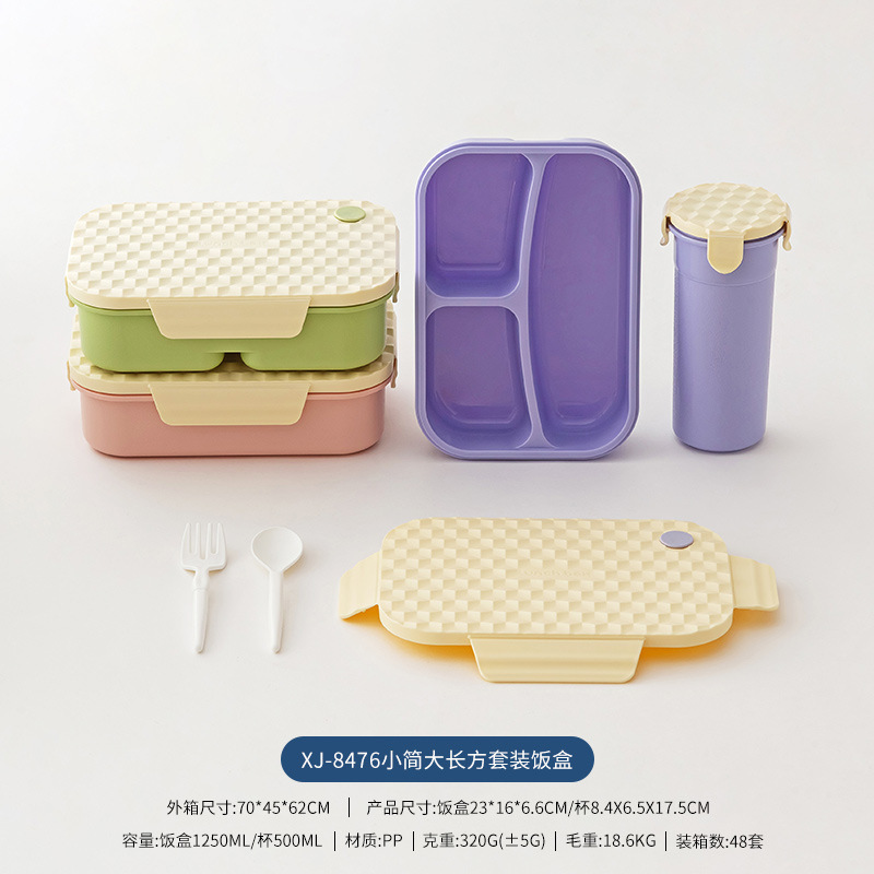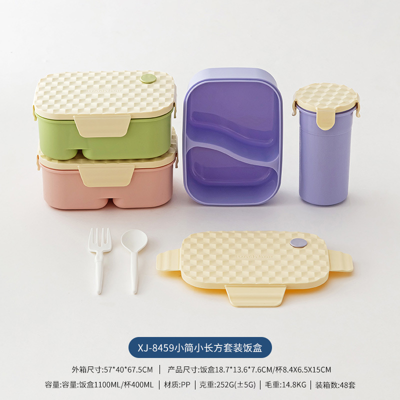 Diamond-pattern plastic lunch box set with cup, student lunch box set with fork and spoon, microwave-safe, and lunch box
