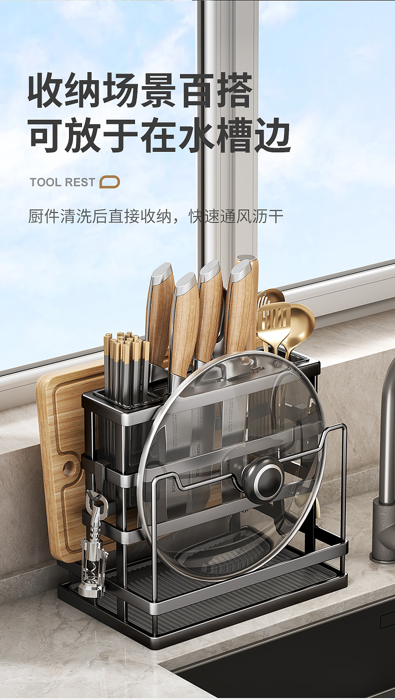 black-knife rest + chopstick canister + chopping board rack + pot cover rack