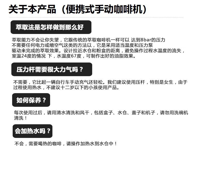 Convenient to use, just add hot water, use Nespresso, Dolce gusto capsules or fresh ground coffee powder, pump water manually.