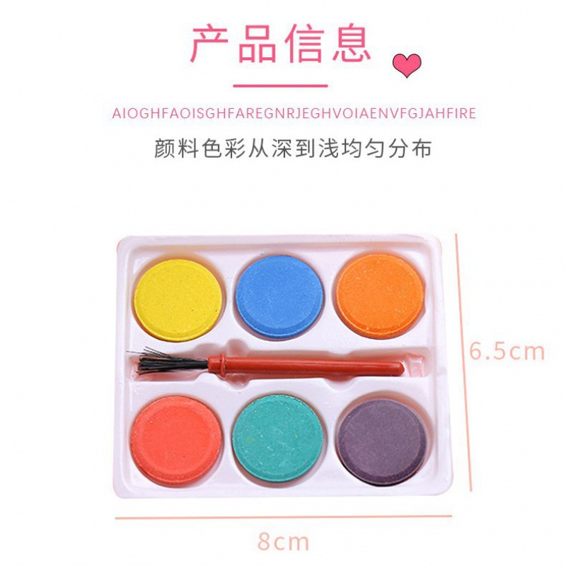 The dimensions are approximately 8cm in length, 6.5cm in width, with a single pigment diameter of approximately 2cm, and the brush is approximately 8.5cm in length.
