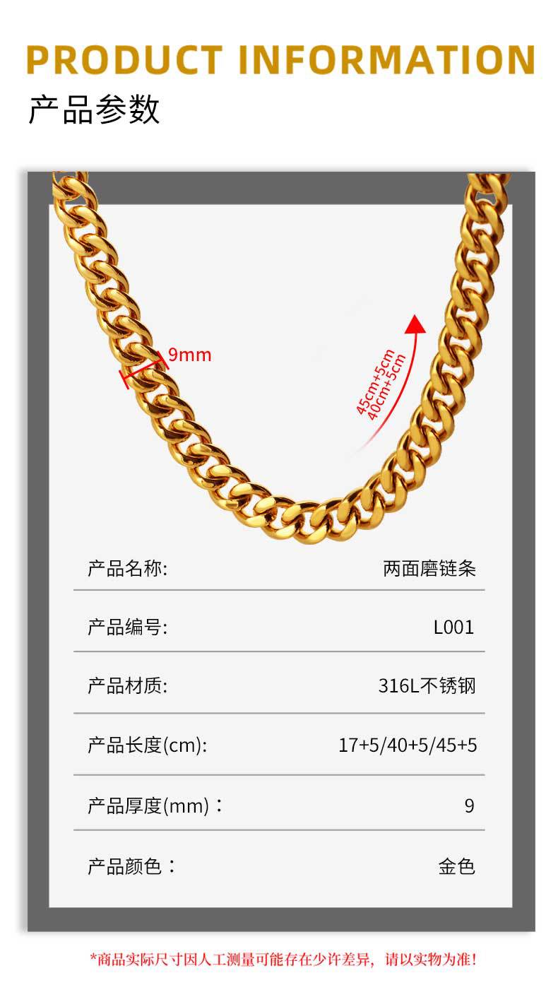 l003 gold: width 8mm * 45cm + 5cm extension chain + tail plate