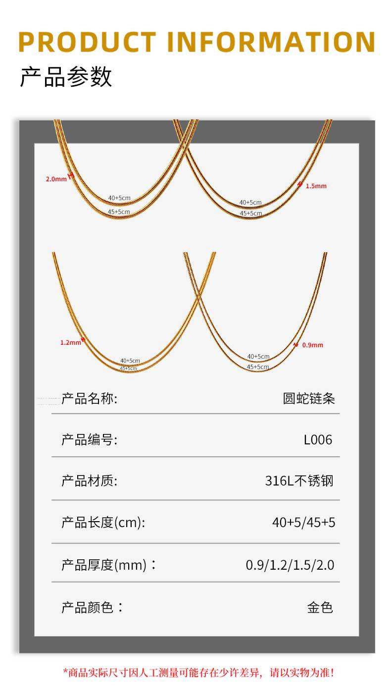 l006 gold: 1.5mm width 40cm + 5cm extension chain + tail plate
