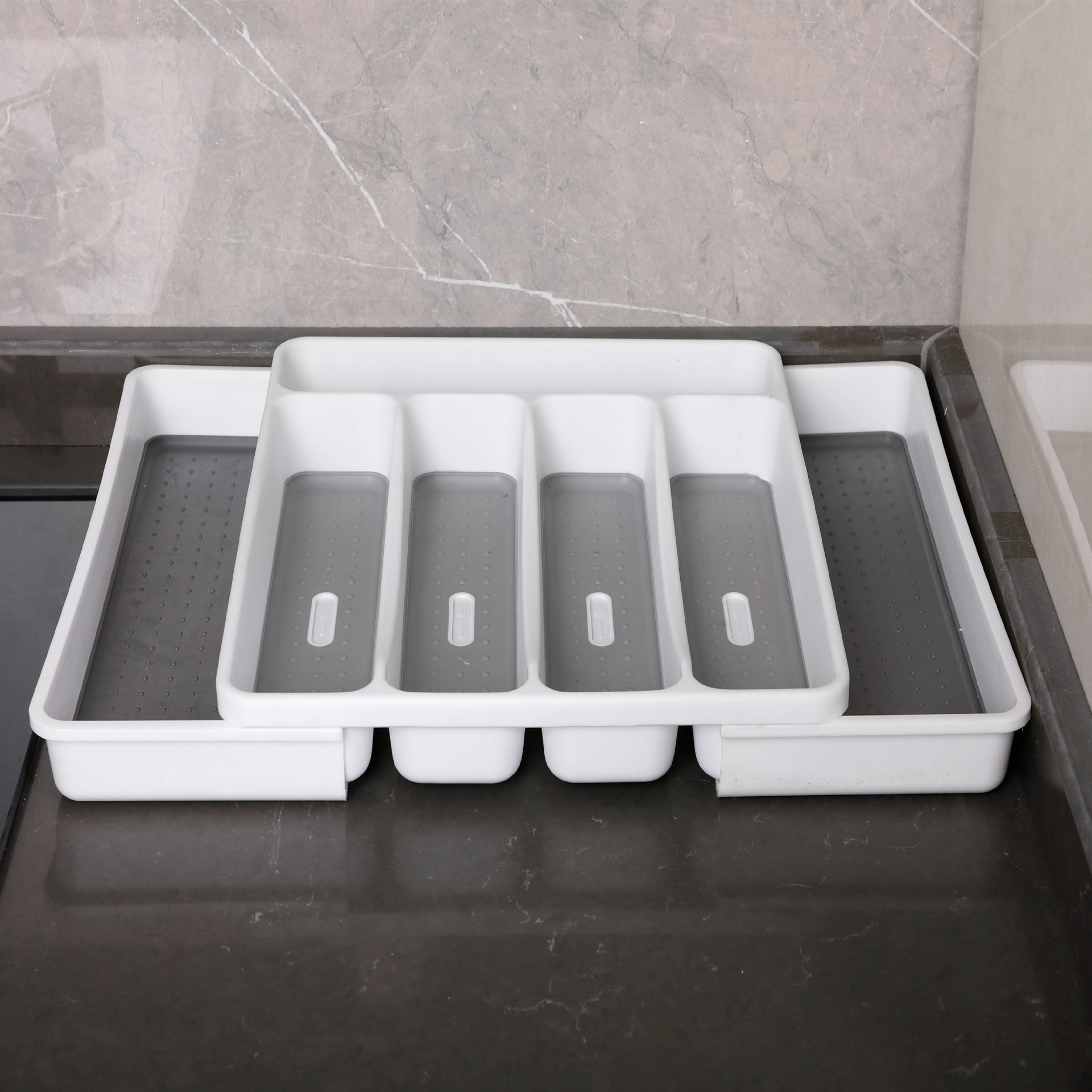 The upgraded 7-compartment fork and knife tray can be easily removed from the left and right sides, allowing for the addition or subtraction of fork and knife compartments based on the types of cutlery. The feature of this 7-compartment extendable fork and knife tray is its freedom and flexibility, allowing for left-right extension, making the use of space both large and small.