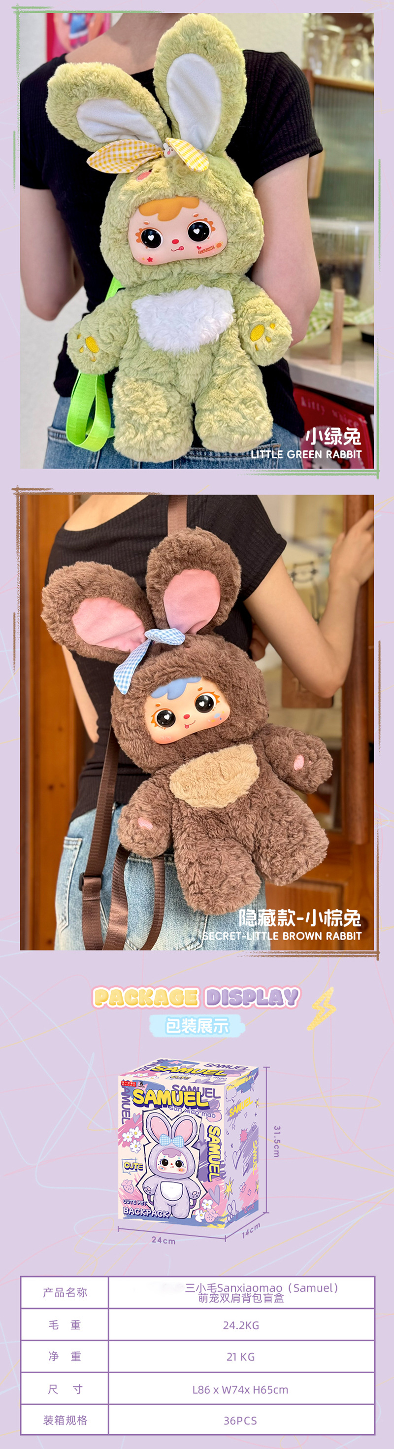 MR1075 Three Little Hair (Samuel) Cute Pet Shoulder Bag 600 Large Fluffy Hanger Blind Box |