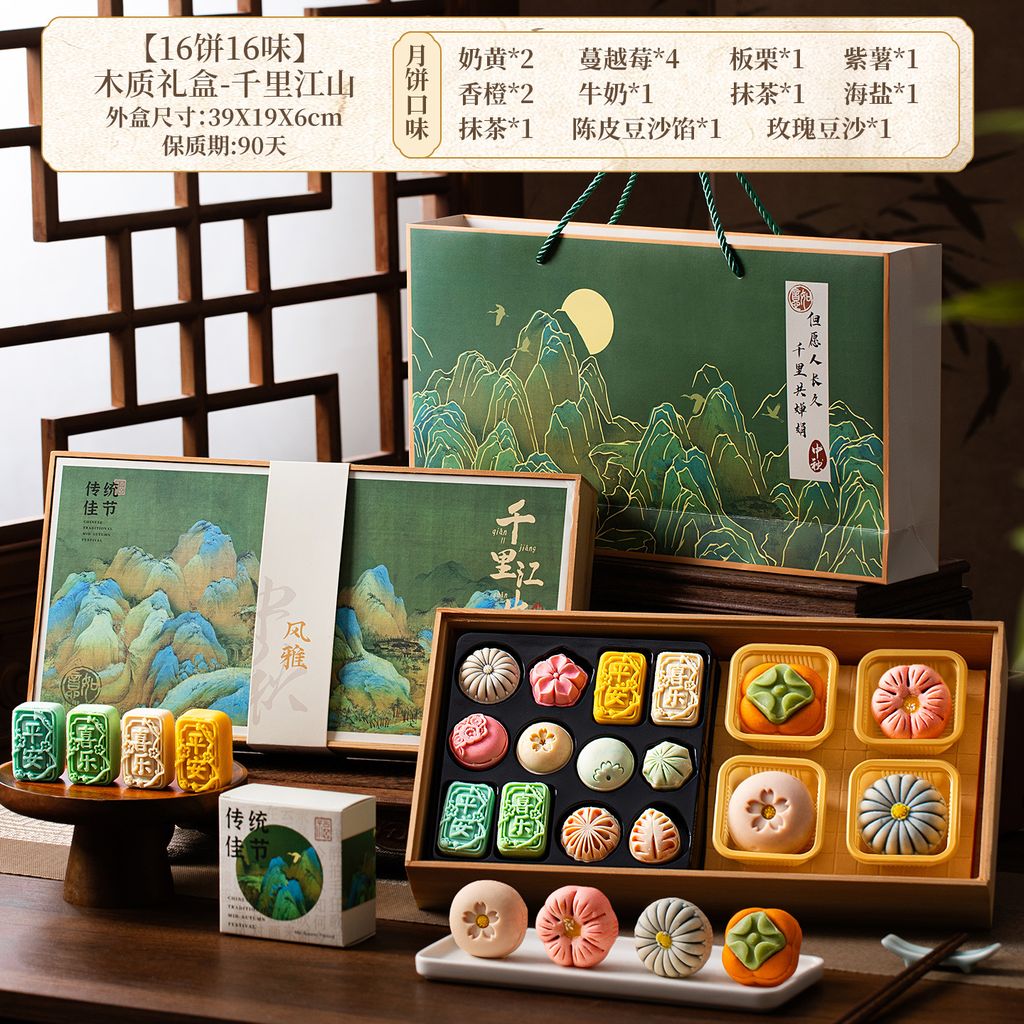 [16 cakes, 16 flavors, 550g in total] wooden present box-thousand-li landscape