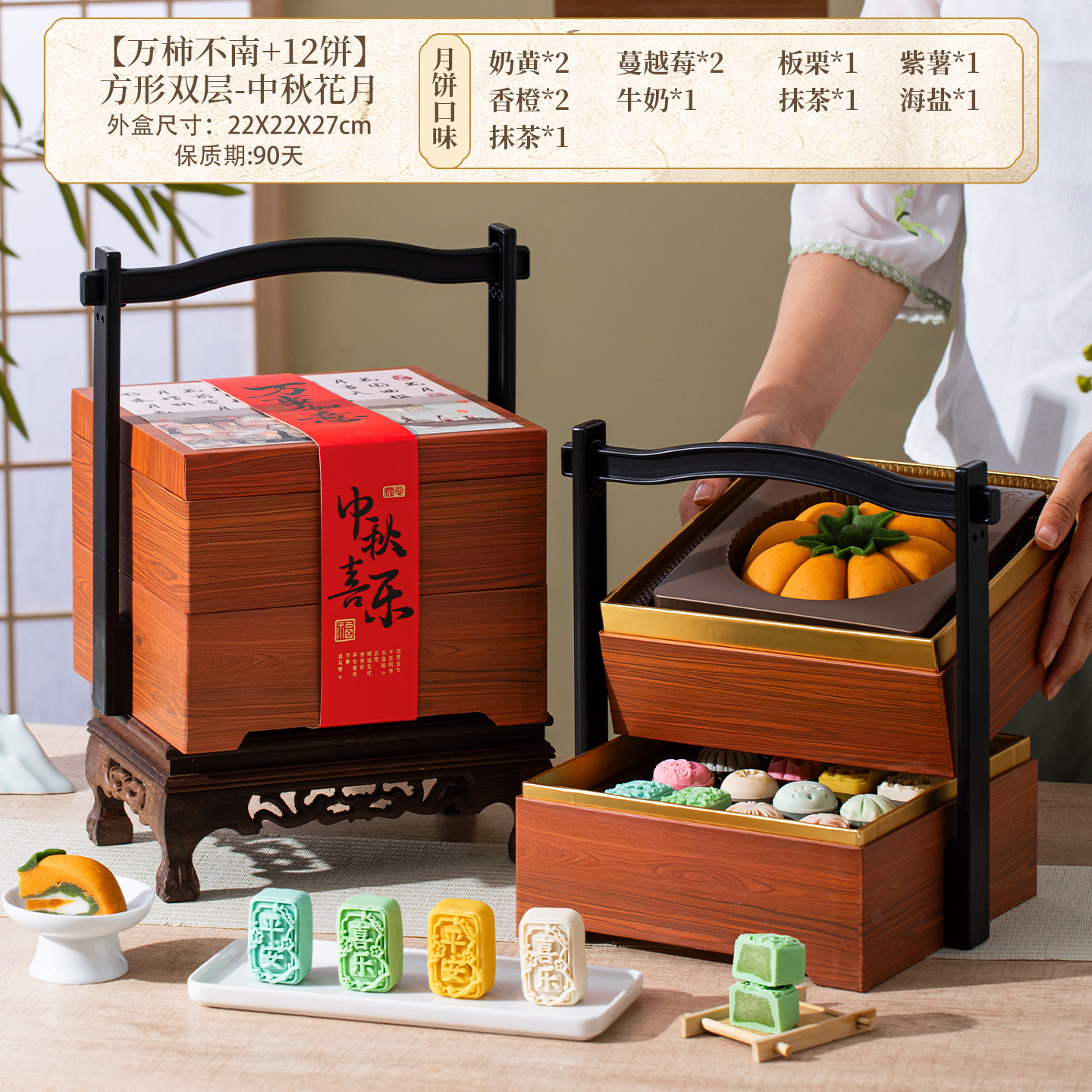 [wanpersimmon south +12 cakes total 690g] square double layer-mid-autumn festival flower and moon