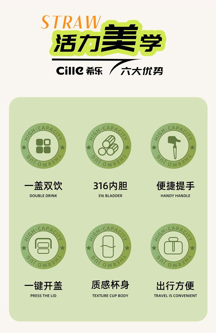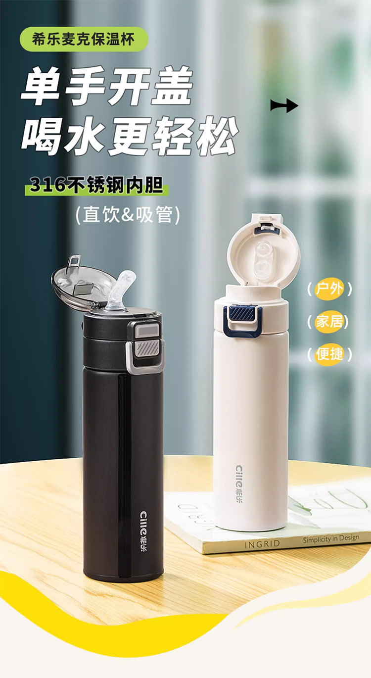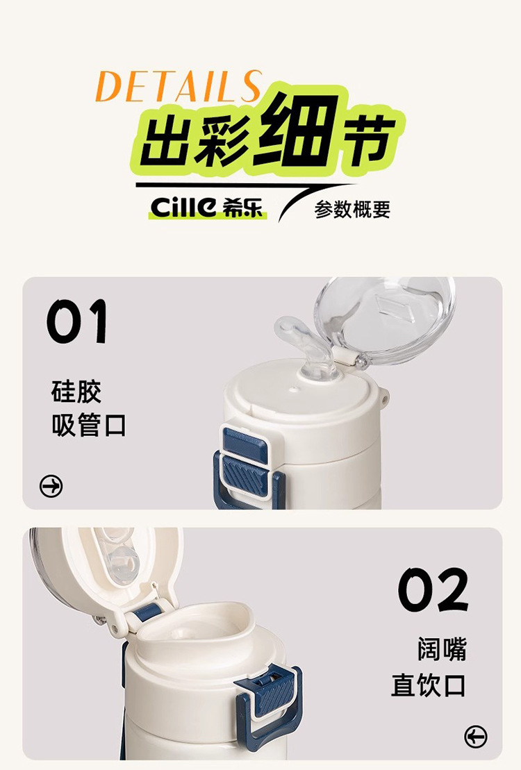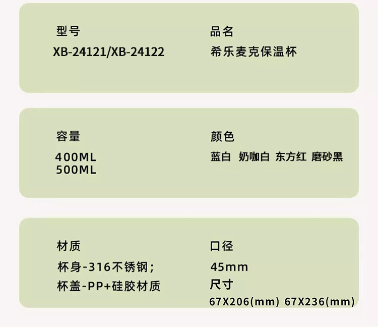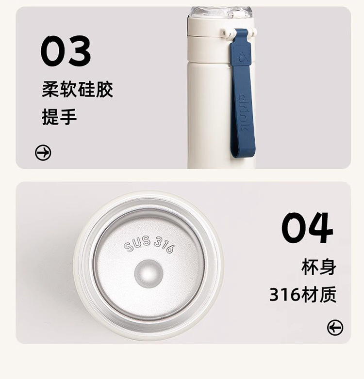 【材质】杯体(内胆316不锈钢、外壳304不锈钢);杯盖(PP);密封圈、吸嘴、吸管(硅橡胶)
