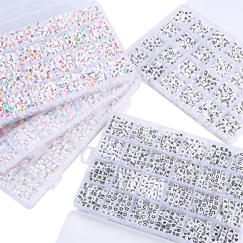24 grid boxed acrylic 26 chopsticks beads set box white background black words/gold words/color words + transparent color words 1200 pcs/box