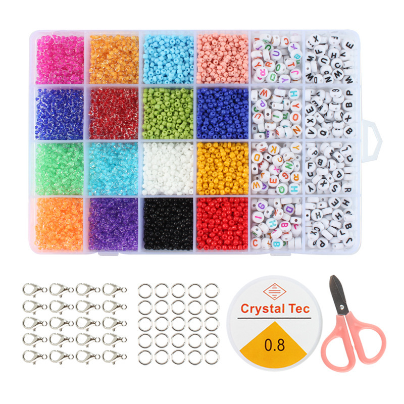 24-Piece 3mm Bead Letter Bead Set: 16 compartments of 3mm beads, each compartment approximately 500 beads, 8 compartments of letter beads, each compartment approximately 50 beads