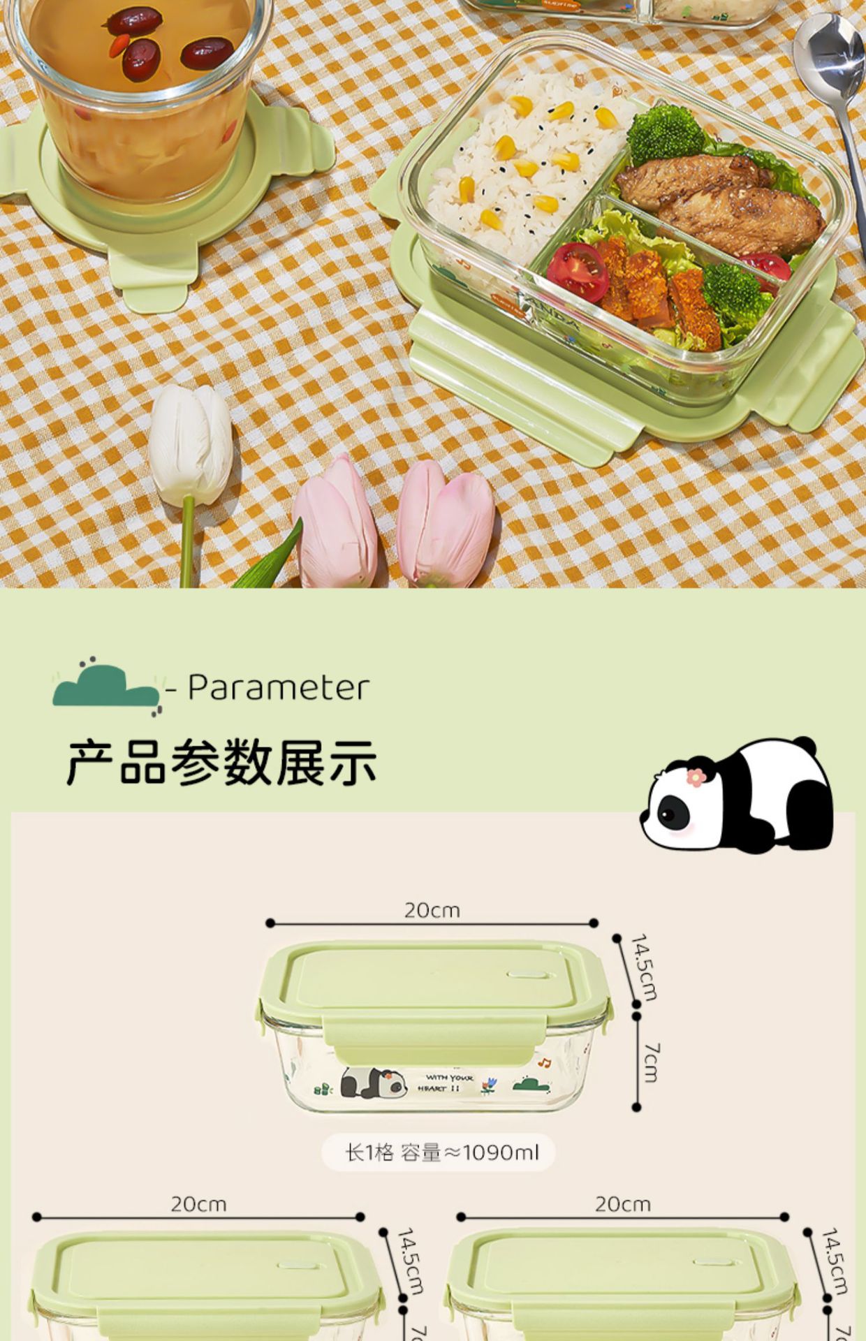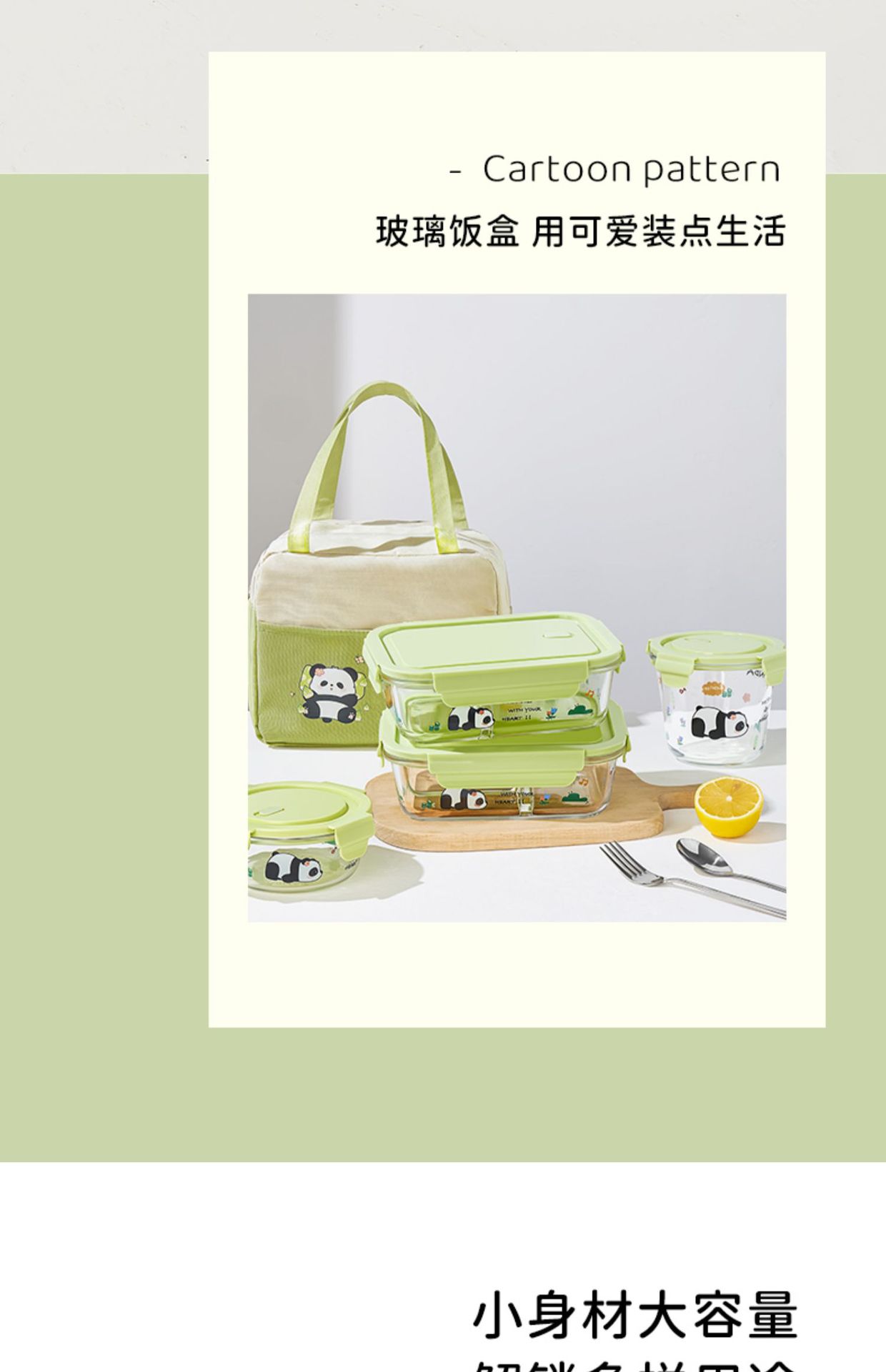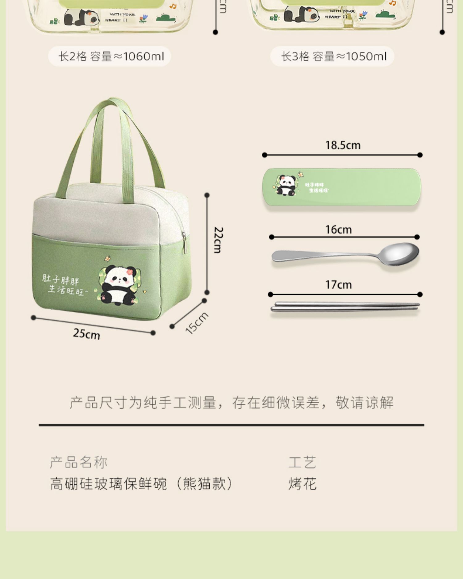 large length without separation 1090ml + small round 480ml + stainless steel tableware + panda bag