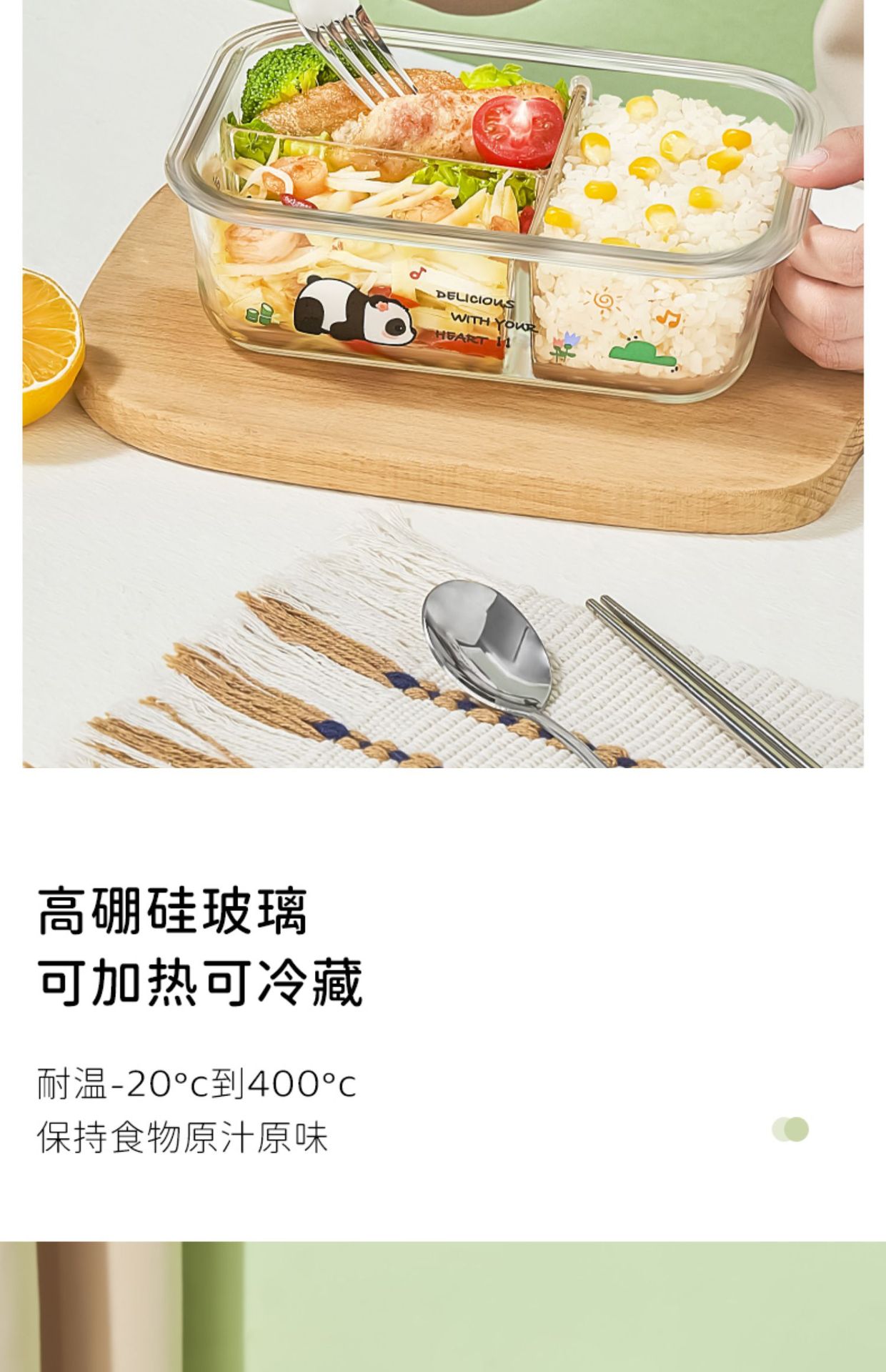 large length 2 compartment 1060ml + stainless steel tableware + panda bag