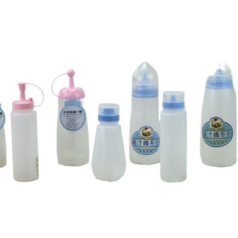 Plastic squeeze bottle for salad dressing, sauce, honey, tomato sauce, sushi, and home use with a pointed tip.