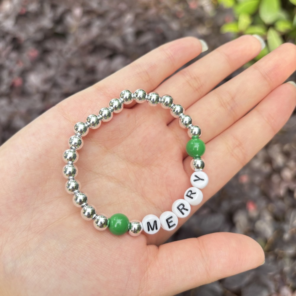 silver beads with letters merry