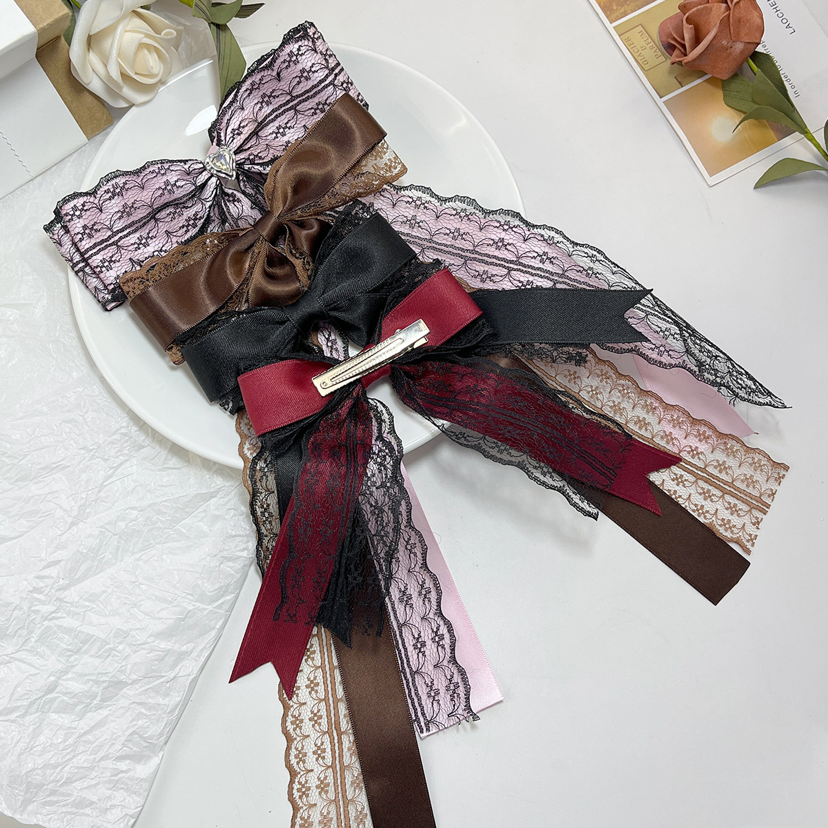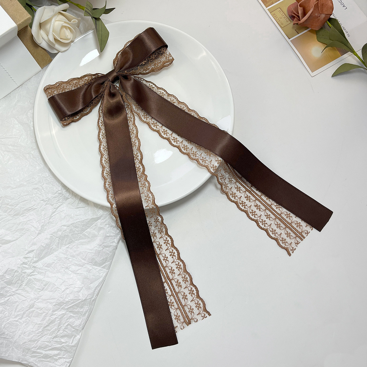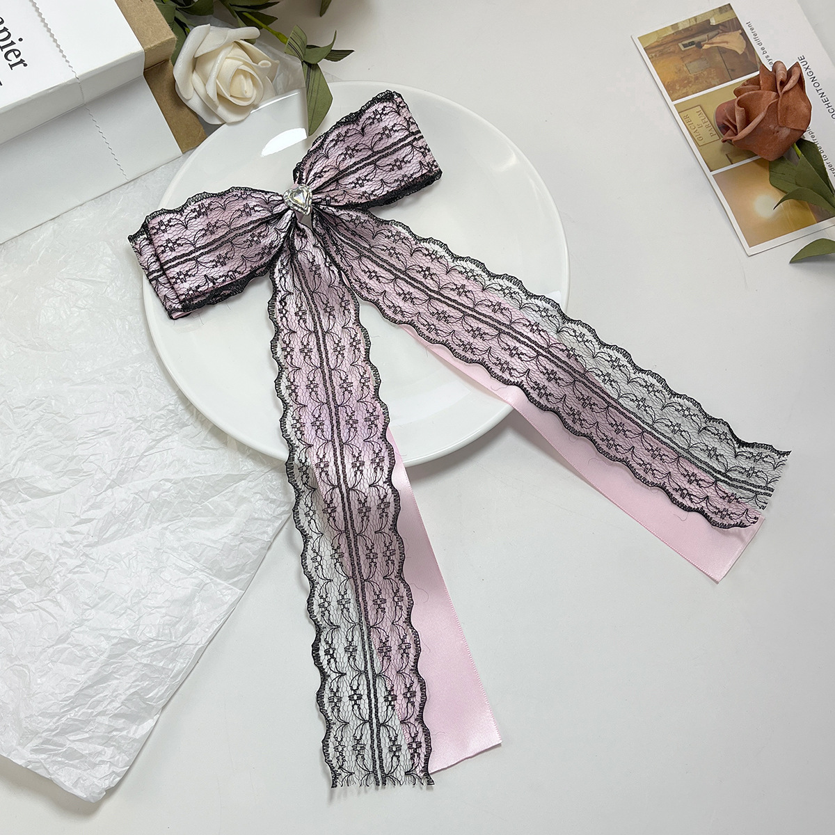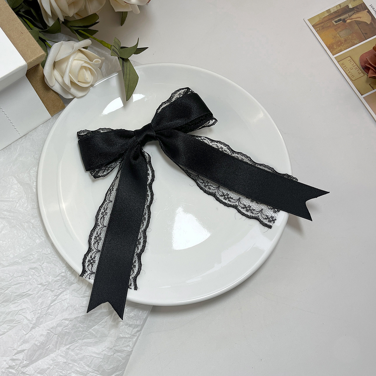 Material: Lace with a bow Size: Length 28cm, width 15cm, weight 14g 5.5 silver beak clamp
