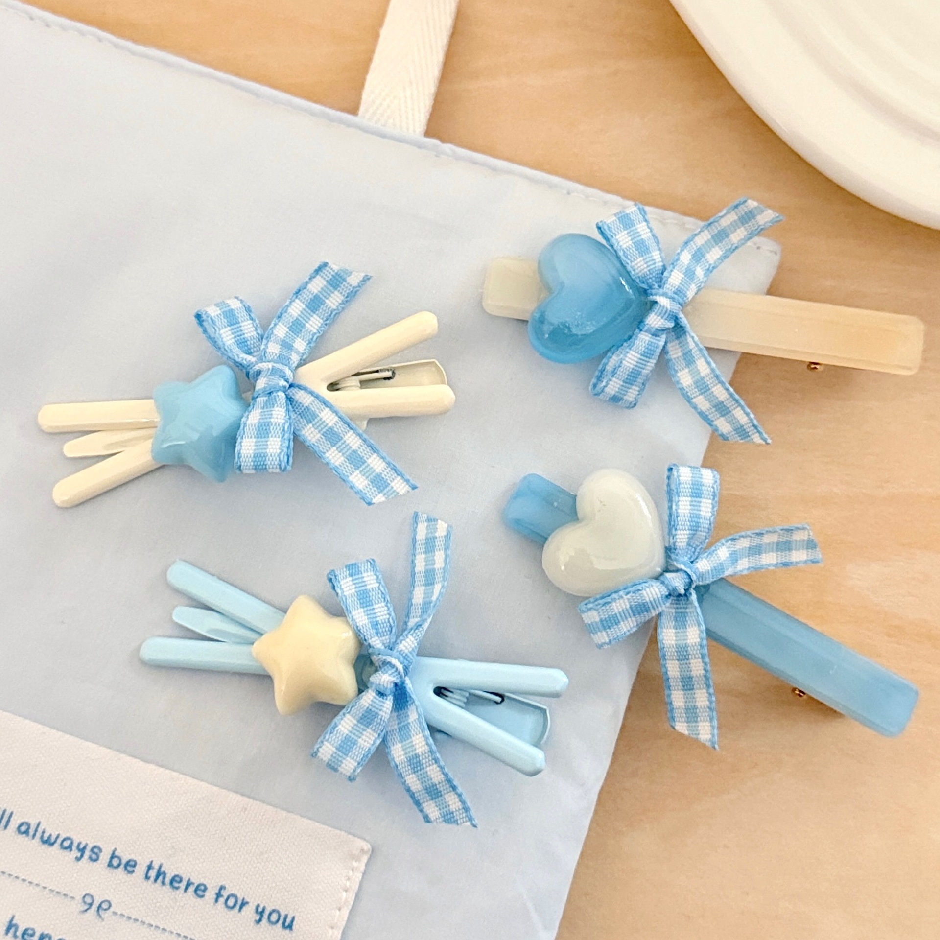 3# milk blue bow gold label barrettes
