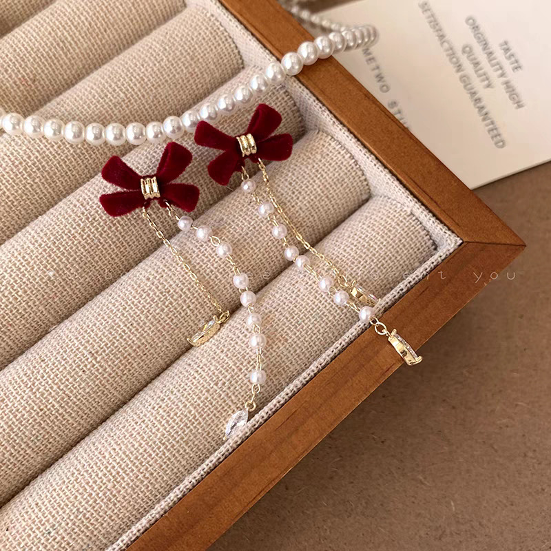 red velvet bow pearl tassel earrings