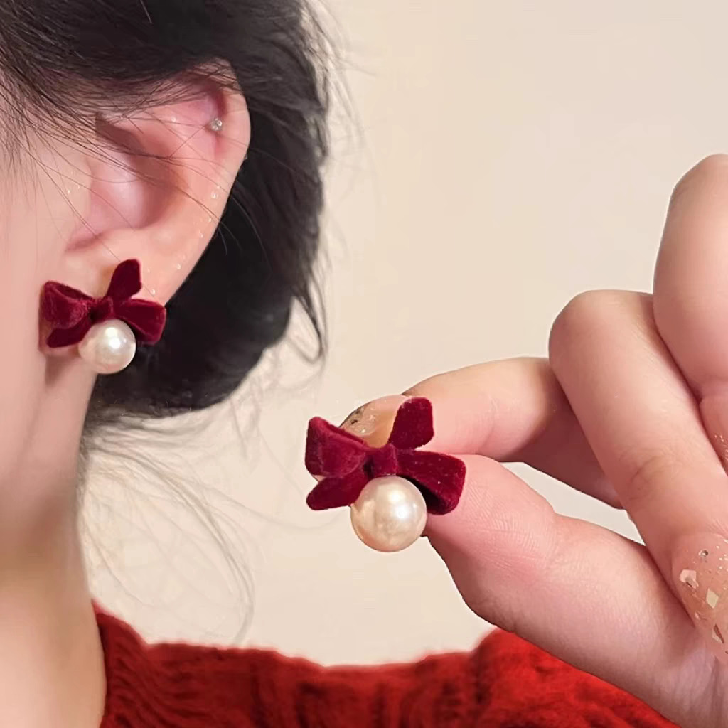 red velvet bow pearl and circle stud earrings