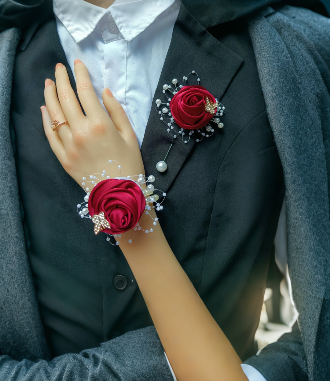 burgundy corsage + wrist flower